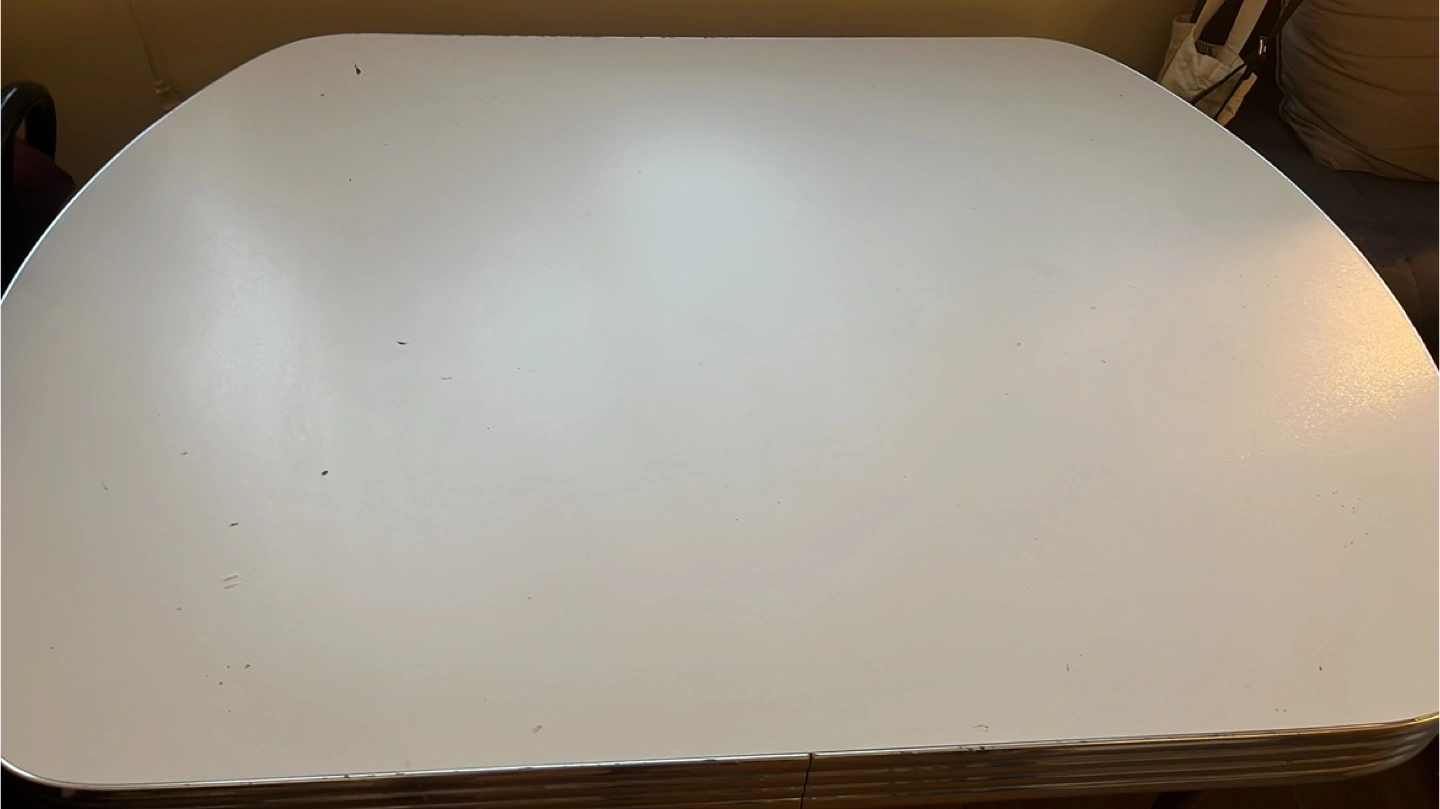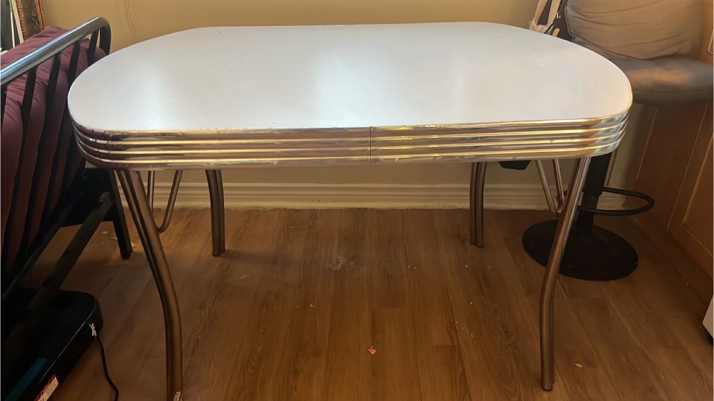 Selling a retro-style dining table with a white top and chrome trim and legs. It's in good condition and would be a great addition to any kitchen or dining room!