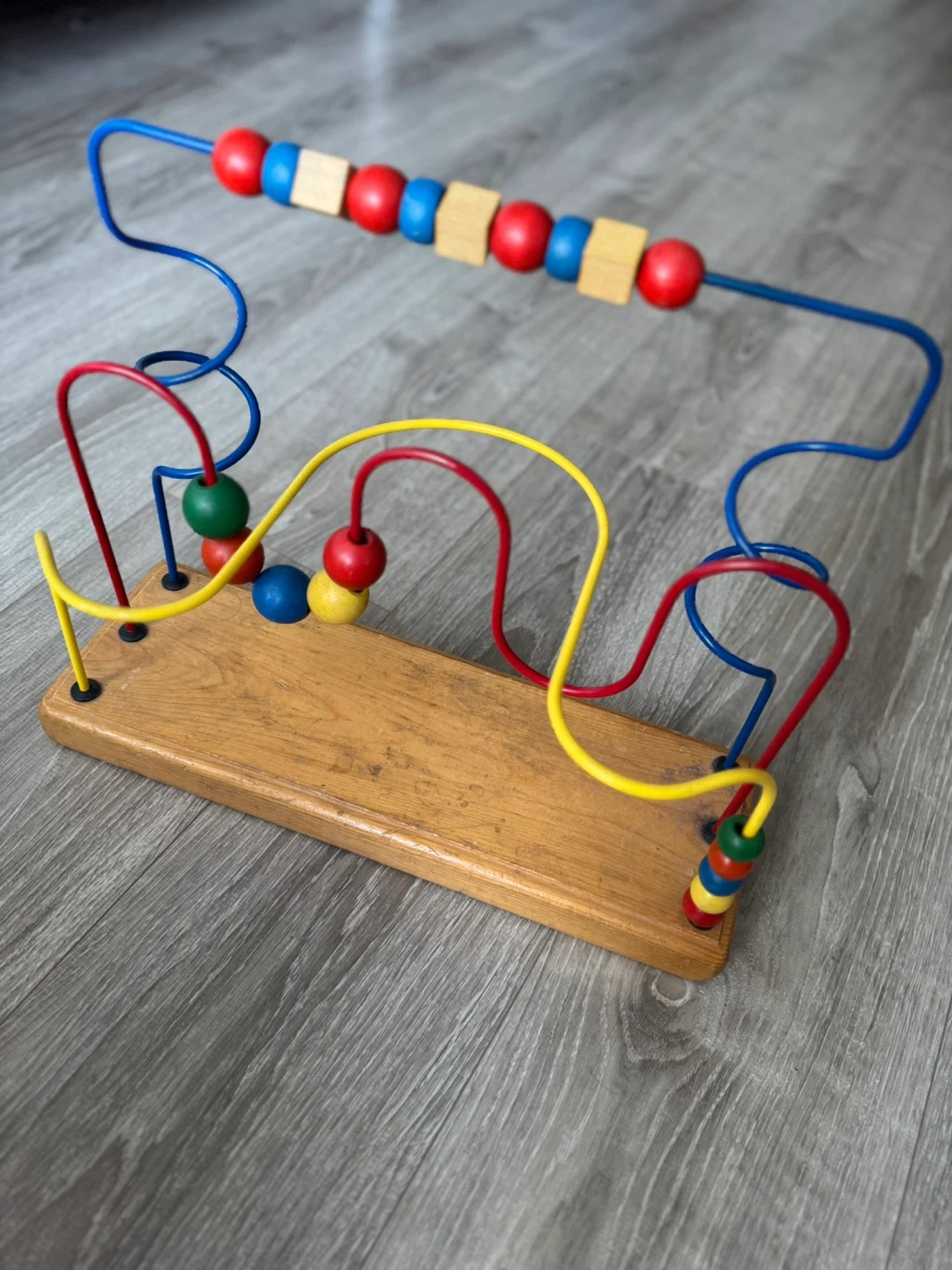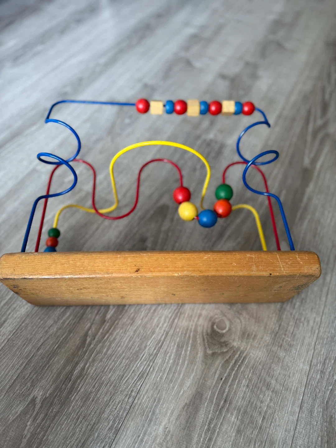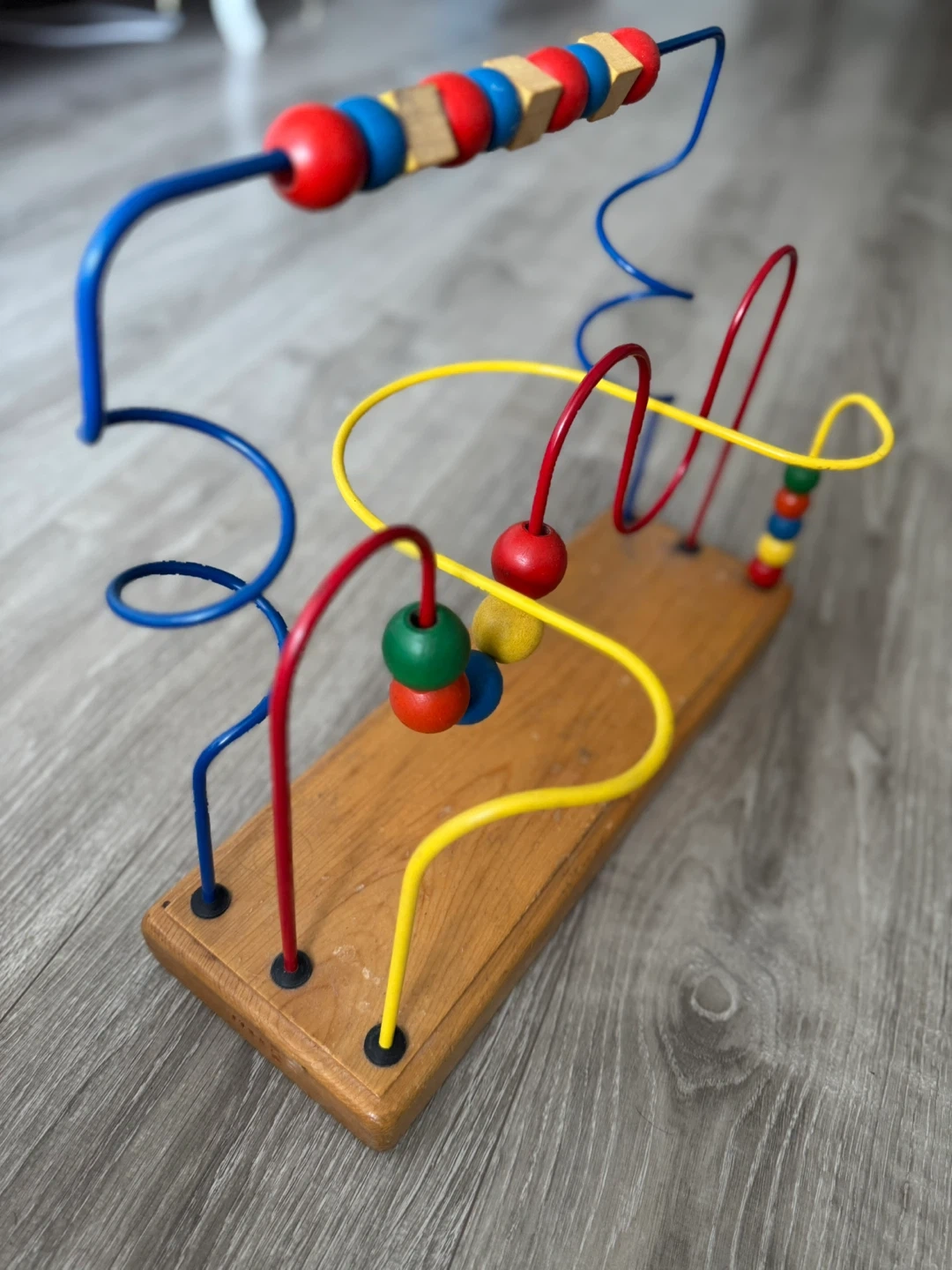 This is a wooden bead maze toy with colourful wires and beads. It features a sturdy wooden base and metal wires. This toy's excellent for developing fine motor skills and hand-eye coordination in little ones!