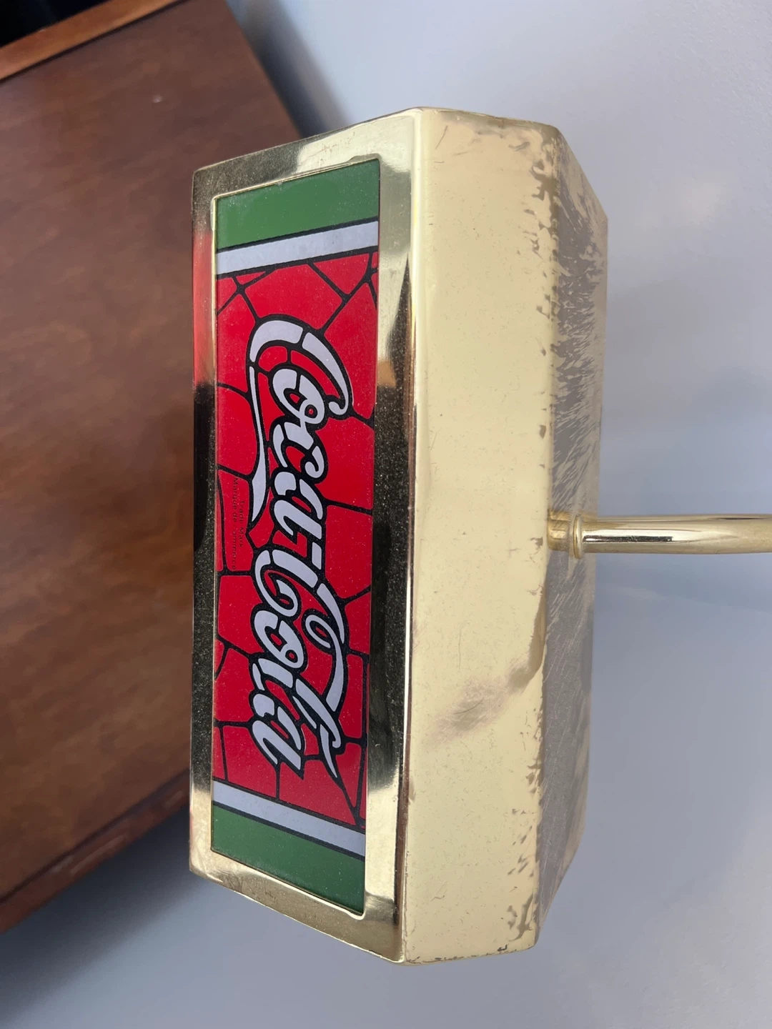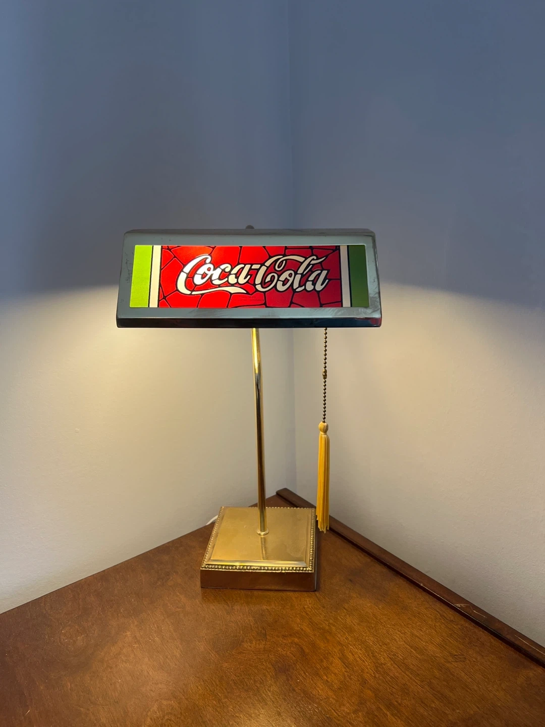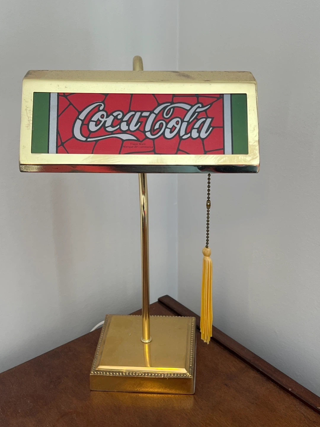 Vintage Coca-Cola desk lamp with a classic logo design. It features a brass-toned base and pole with a pull chain and tassel. This lamp's nostalgic appeal makes it a cool accent piece for a den or home office. There is some tarnish marks on the top and back mostly, with proper cleaner might be able to bring back.