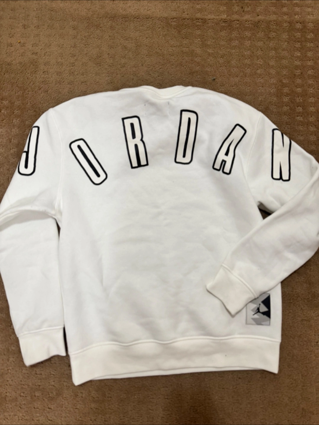 Men's off-white Jordan crewneck sweatshirt. Features a Jumpman logo on the chest and large 'JORDAN' lettering on the back. Long sleeves, comfortable cotton material. It’s fits large.