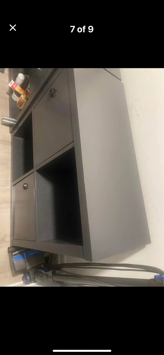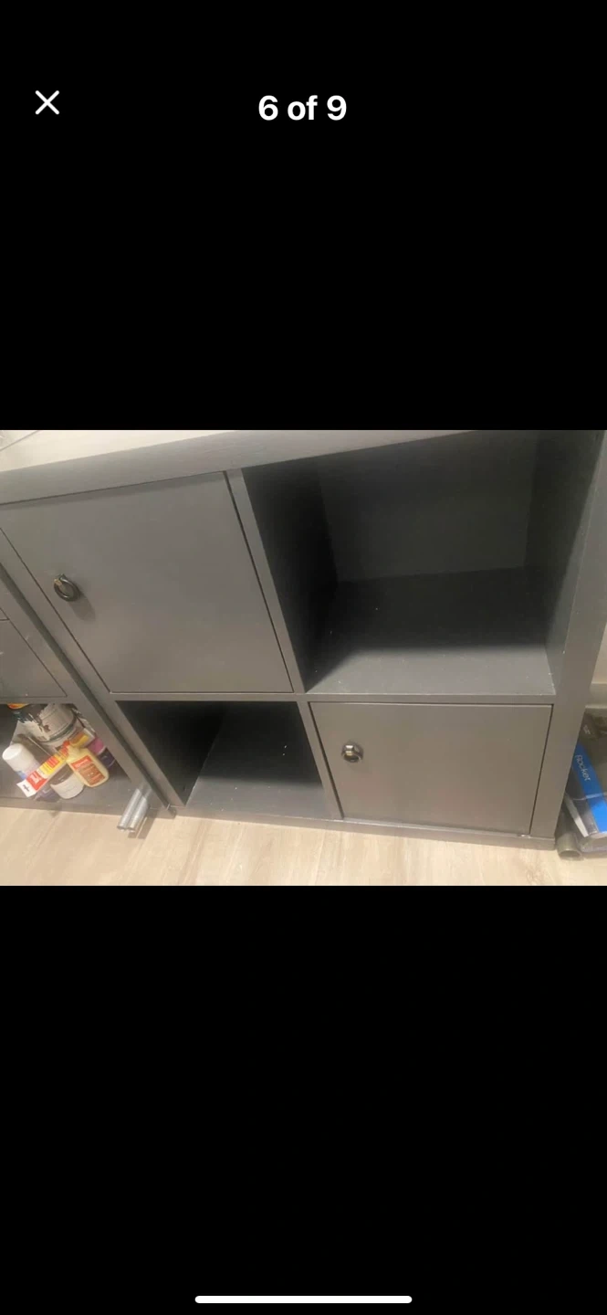 This grey cube storage unit has a versatile design with two open shelves and two enclosed cabinets. Each cabinet has a black ring pull handle for easy access. It's great for organizing books, toys, or other household items. The unit offers a clean look that fits in most rooms.