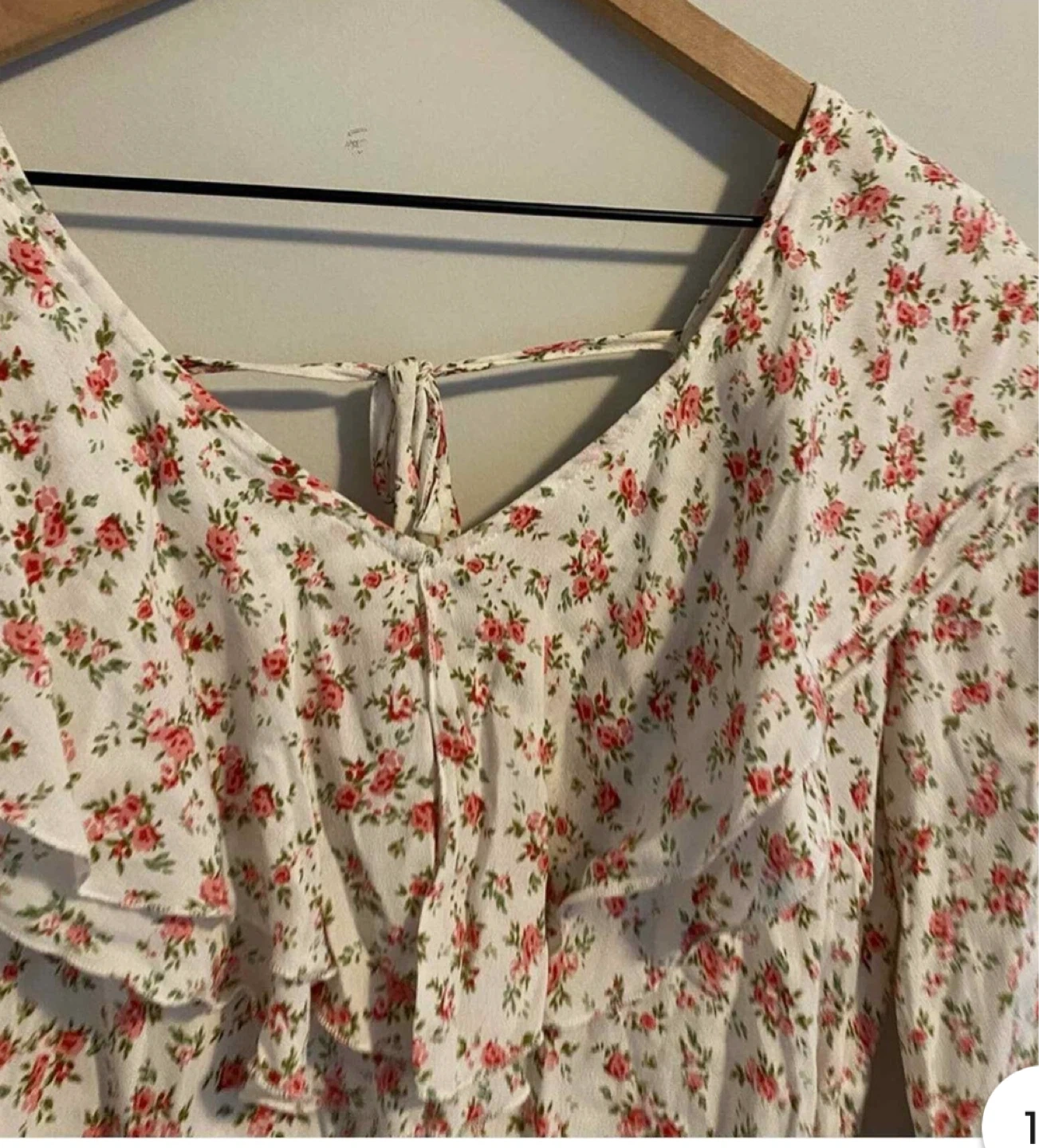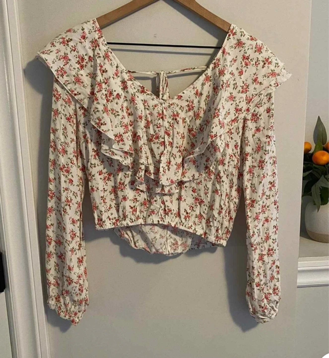 This is a lovely cropped top with a white base and a white, pink, and green floral print. It's made of rayon and features a ruffled neckline and long sleeves. Size is small.