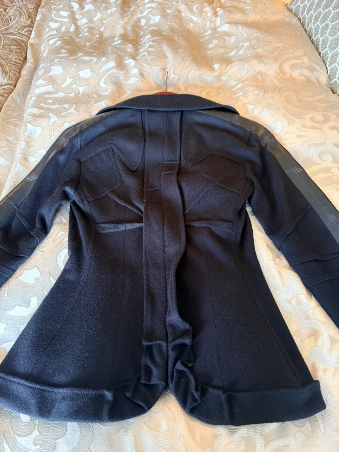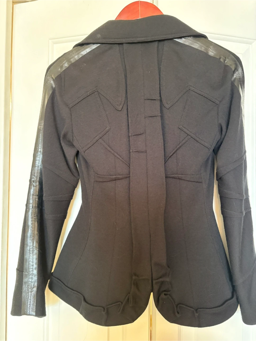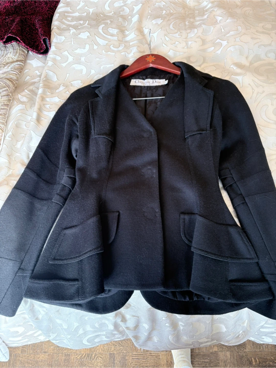 This Christian Dior jacket has a structured silhouette with distinct flair at the waist, discreet snap closures and interesting details on the back and sleeves. This jet black blazer turns heads whether dressed up or down.