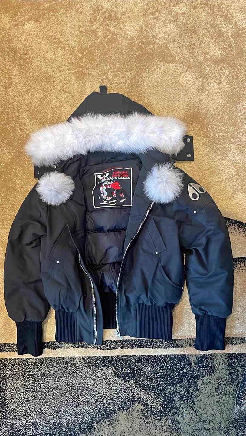 This is a Moose Knuckles down-filled bomber jacket. It's black with a white fur-lined hood and white pom-poms on the front. Made in Canada.