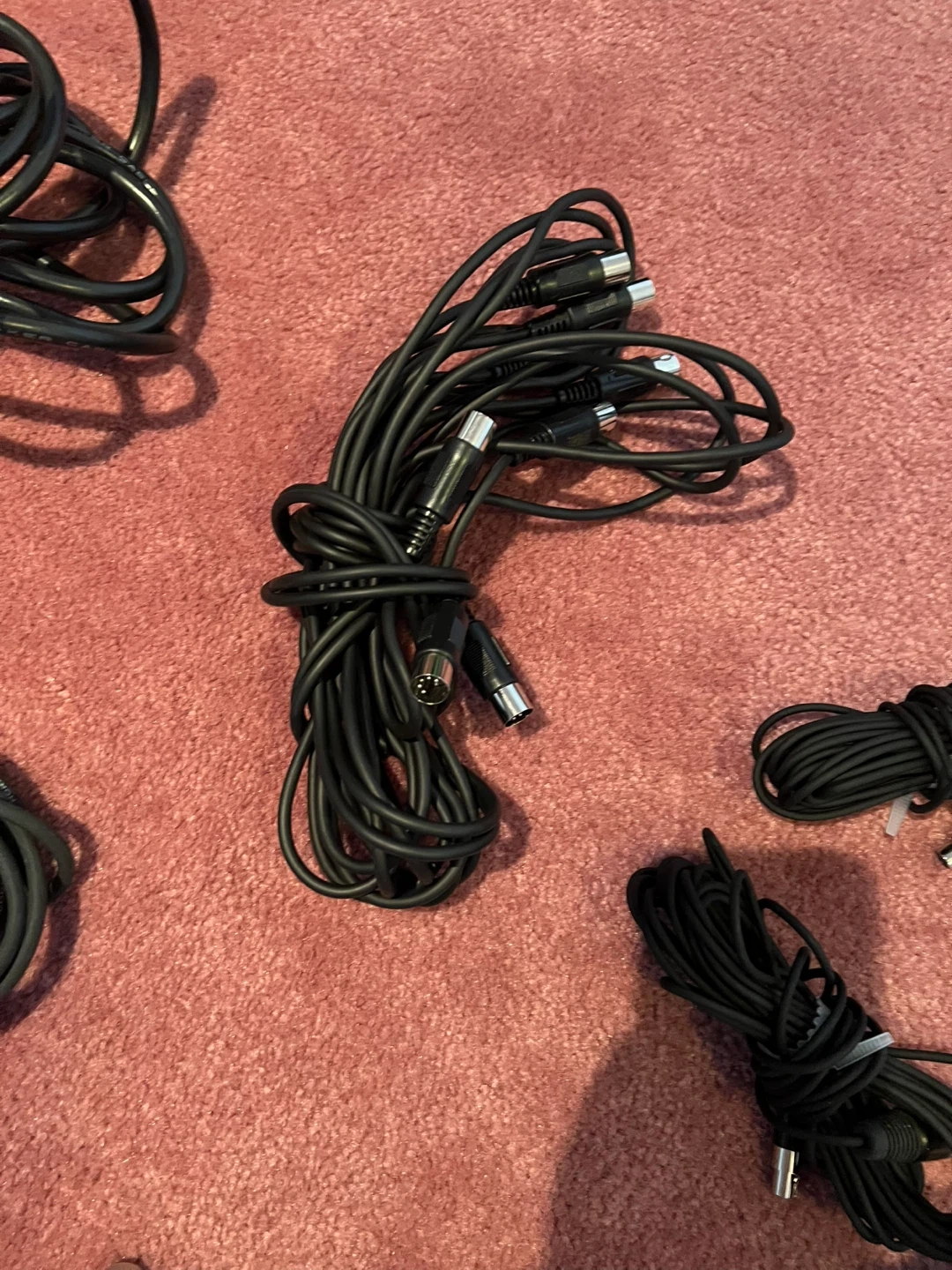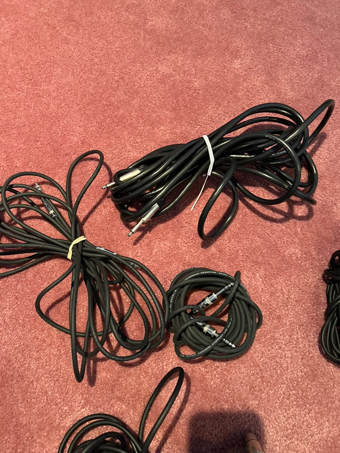 Bundle of black audio cables. Includes various lengths and connector types. Mostly Rapco Horizon branded, low noise, balanced microphone cables. All cables are in good condition and ready for use!