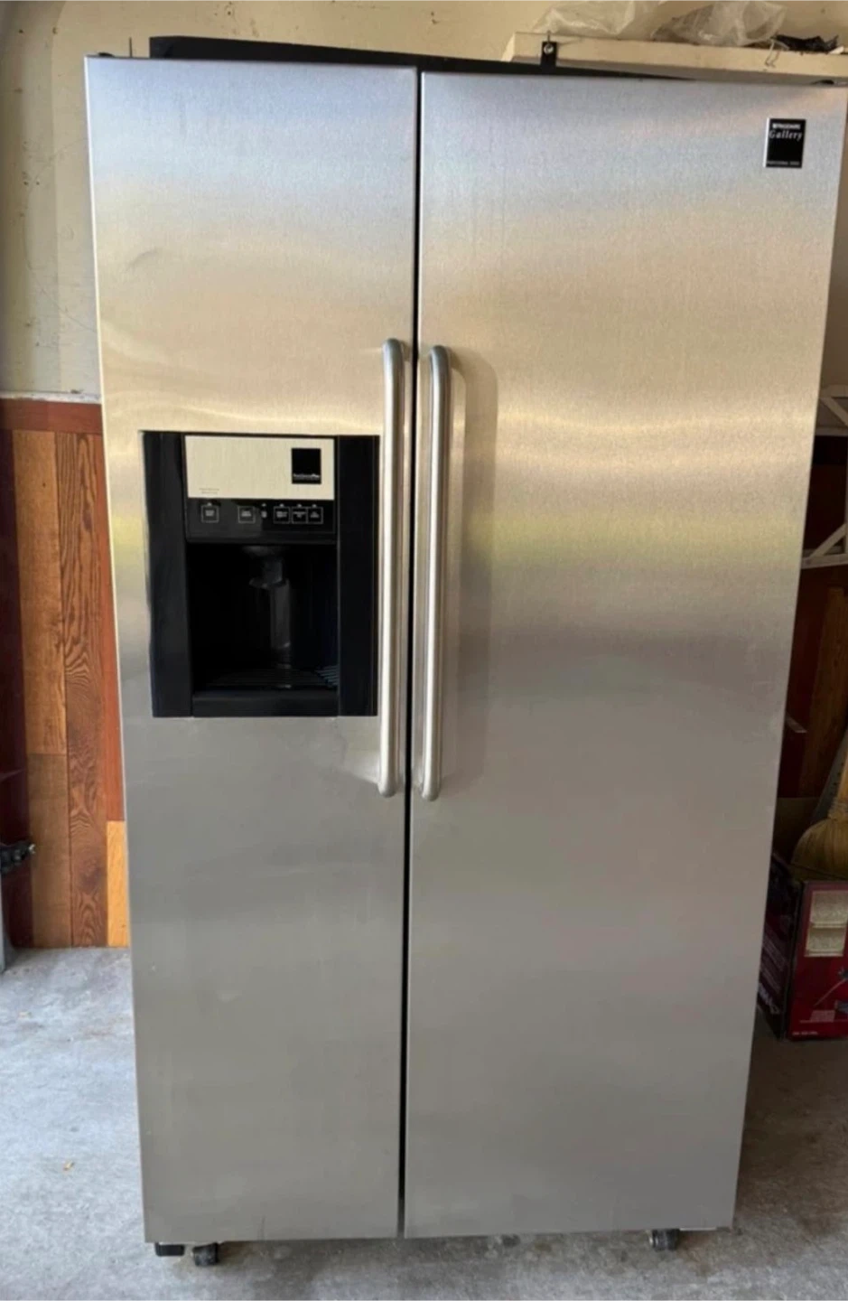 This is a stainless steel side-by-side refrigerator from KitchenAid. It features an external ice and water dispenser. The unit is in good condition.