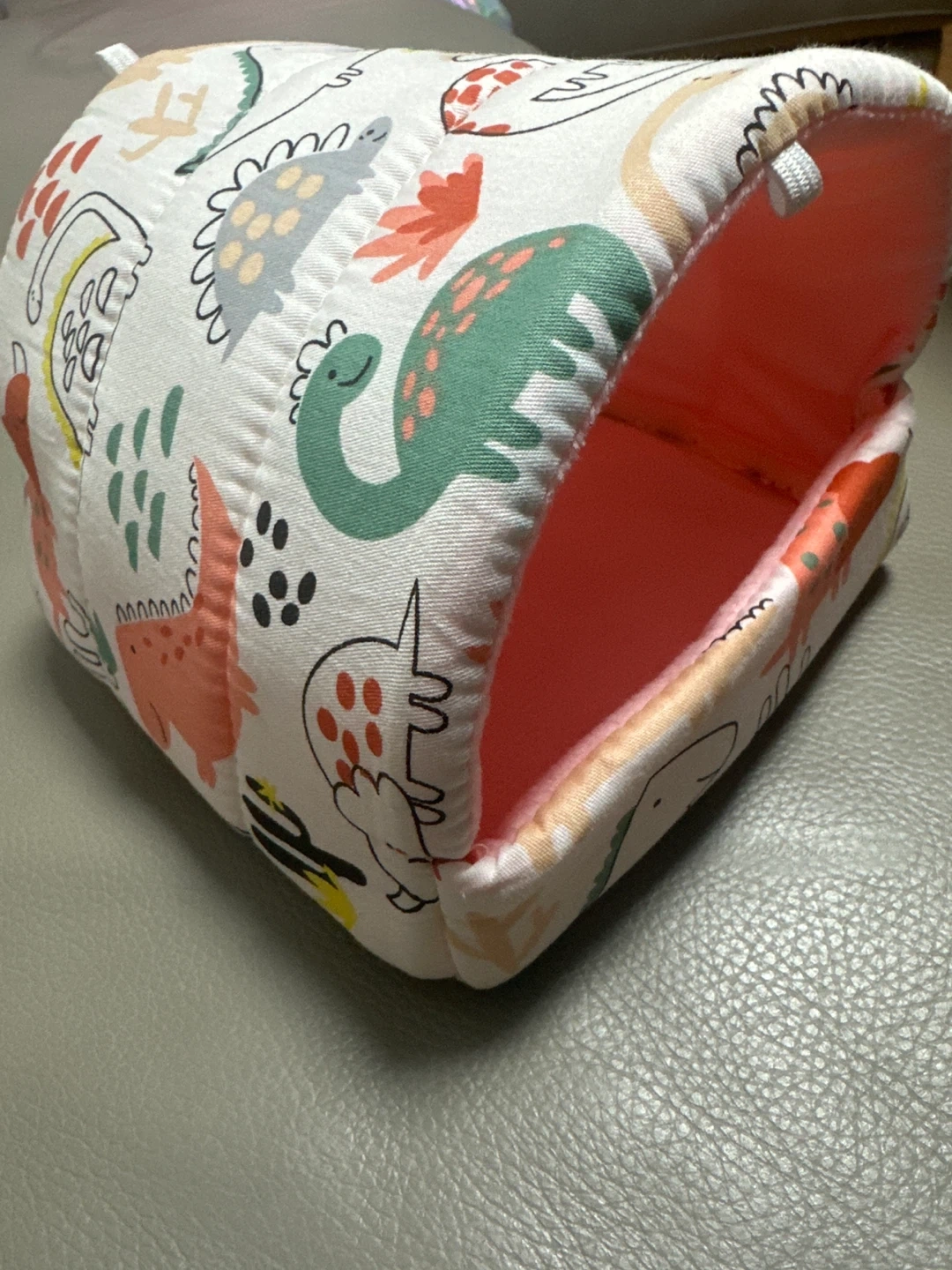 This soft pet bed house features a fun dinosaur print. It's designed for small pets to snuggle up in. The interior is lined with a soft, cozy material. Small size and it is for guinea pig
