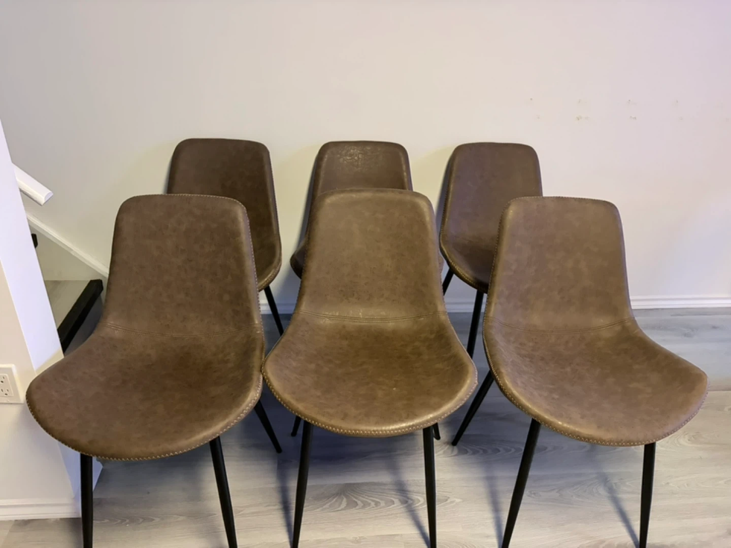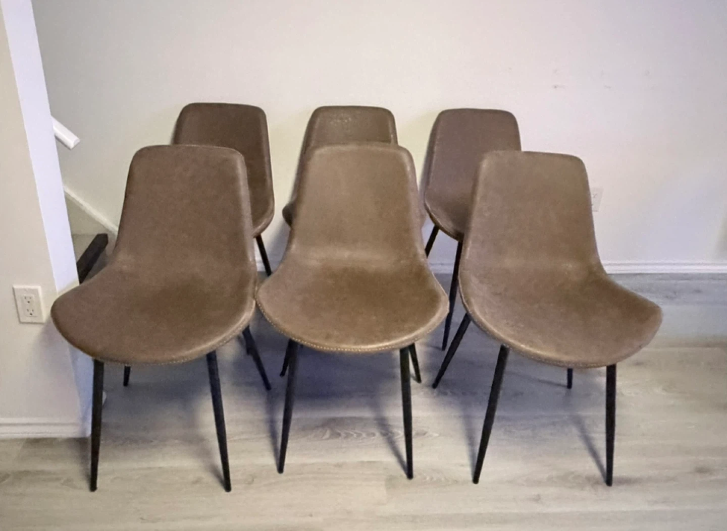 Set of six dining chairs upholstered in brown faux leather. These chairs have black metal legs and a curved back design. They're great for adding extra seating to your dining room or kitchen area!