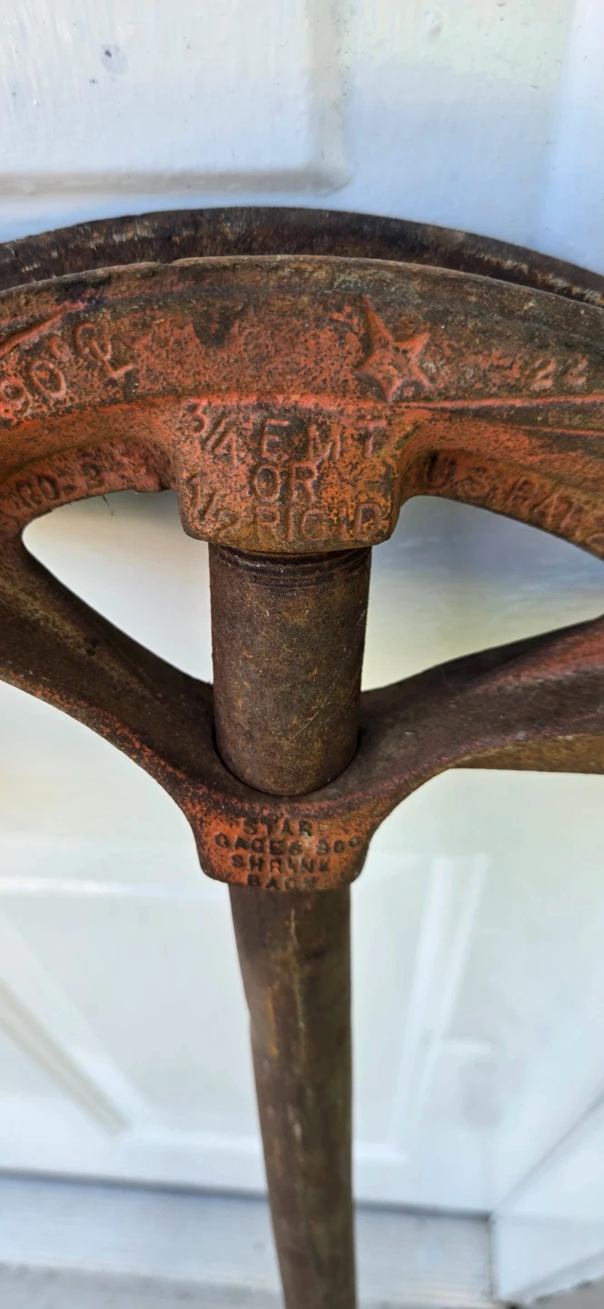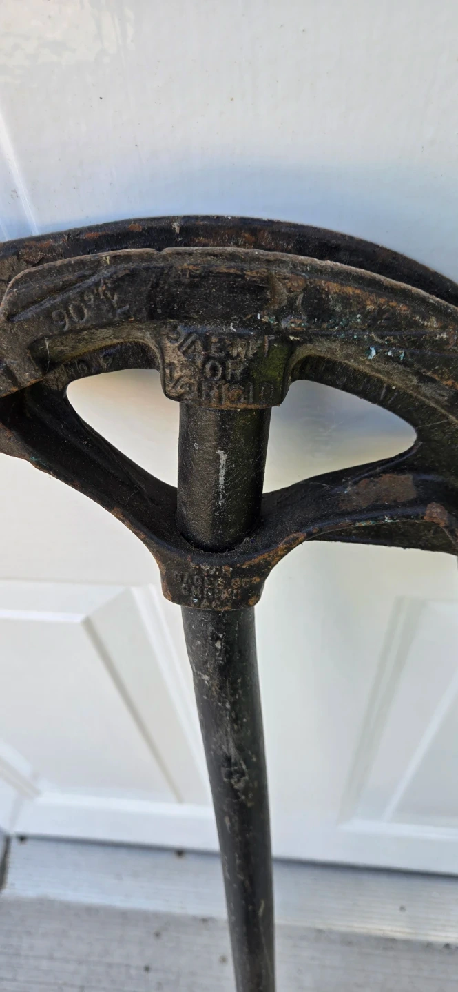 Set includes two conduit benders. One is red cast iron and marked '3/4 EM TR 90'. The other is black cast iron. Also includes a blue handle conduit bender with legible "3/4 In. Conduit Bender" text.