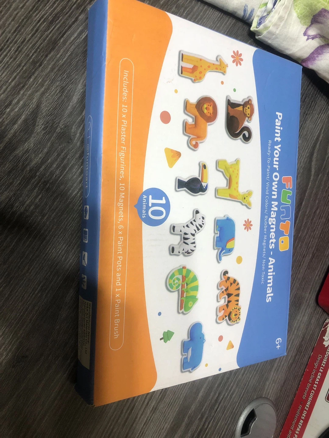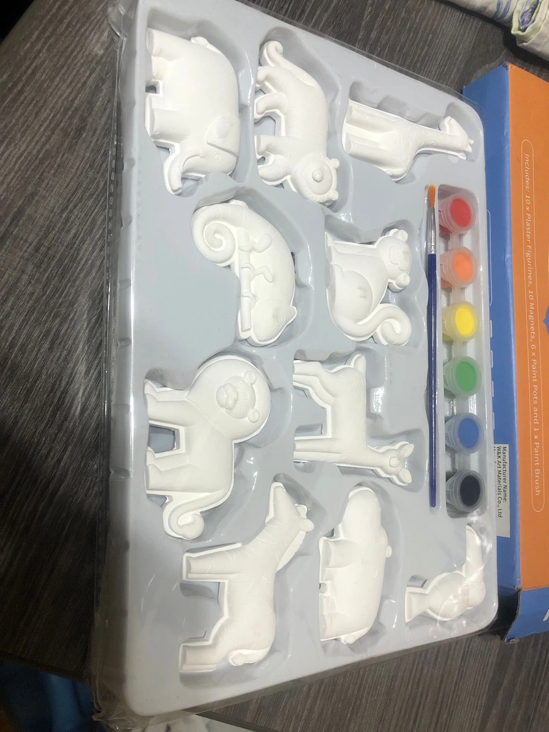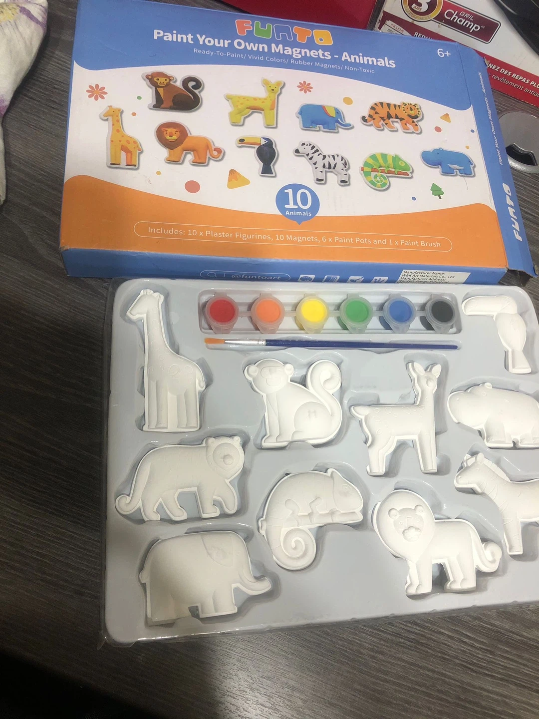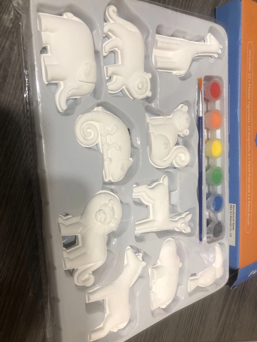 This New Funto set includes 10 plaster animal figurines, 10 magnets, 6 paint pots, and 1 paint brush. Ready to paint with vibrant colours. Non-toxic materials.
