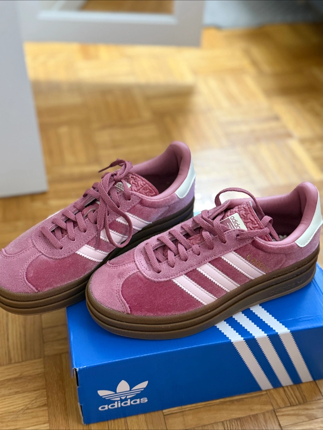 Selling a pair of Adidas Gazelle Bold sneakers in a beautiful pink velvet! These shoes are super stylish and unique. They come with the original box