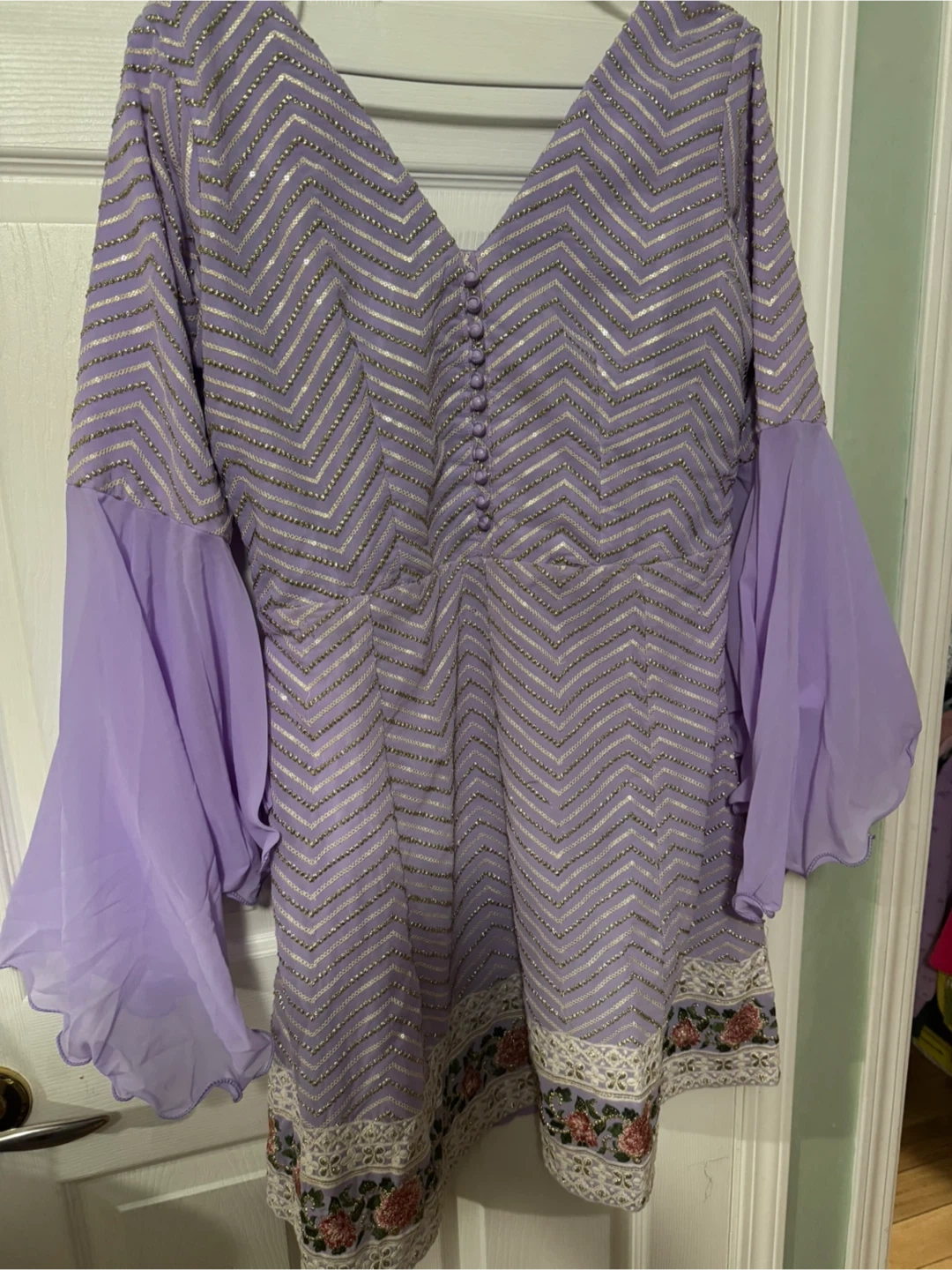 This is a lovely three-piece outfit for women. It features a purple kurti adorned with intricate silver sequin and beadwork in a chevron pattern, with embroidered floral detailing at the hem. Matching purple pants and a sheer dupatta are included. It's perfect for cultural events or festive occasions!