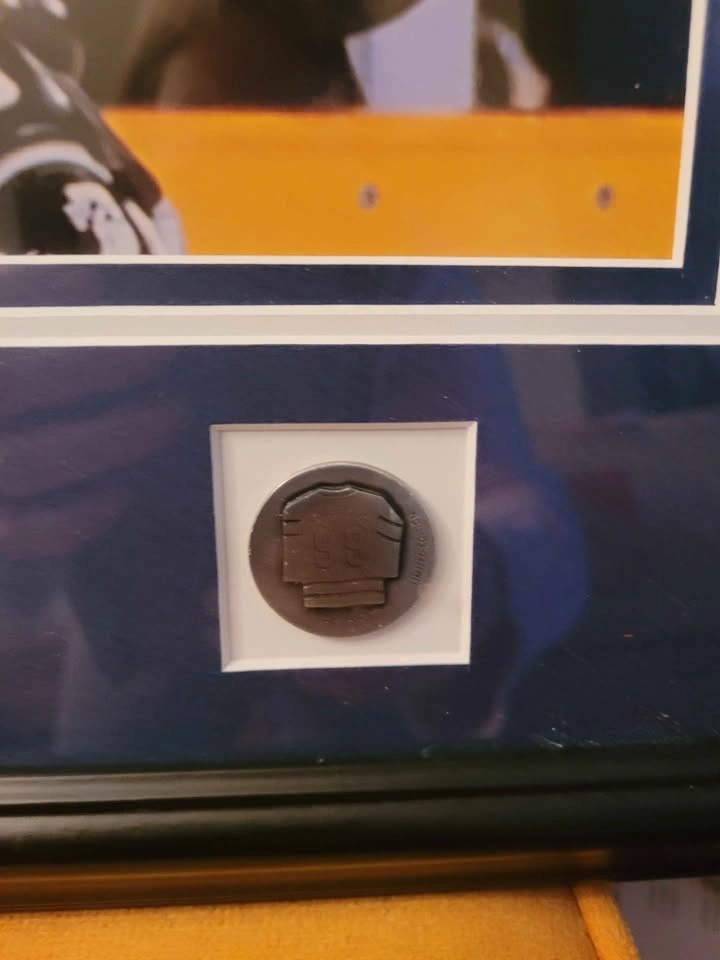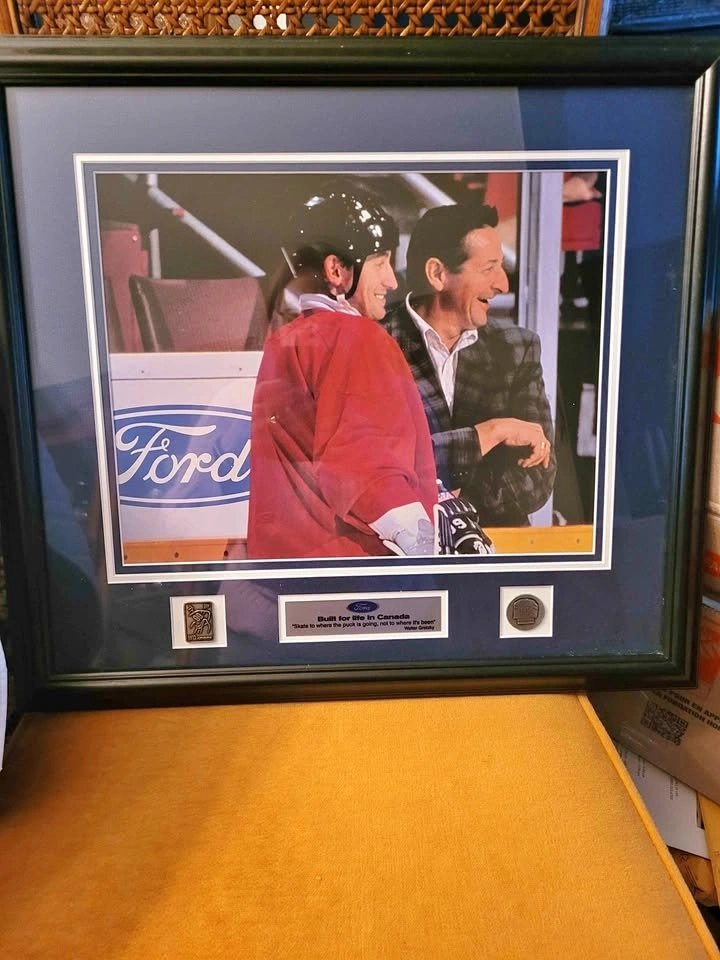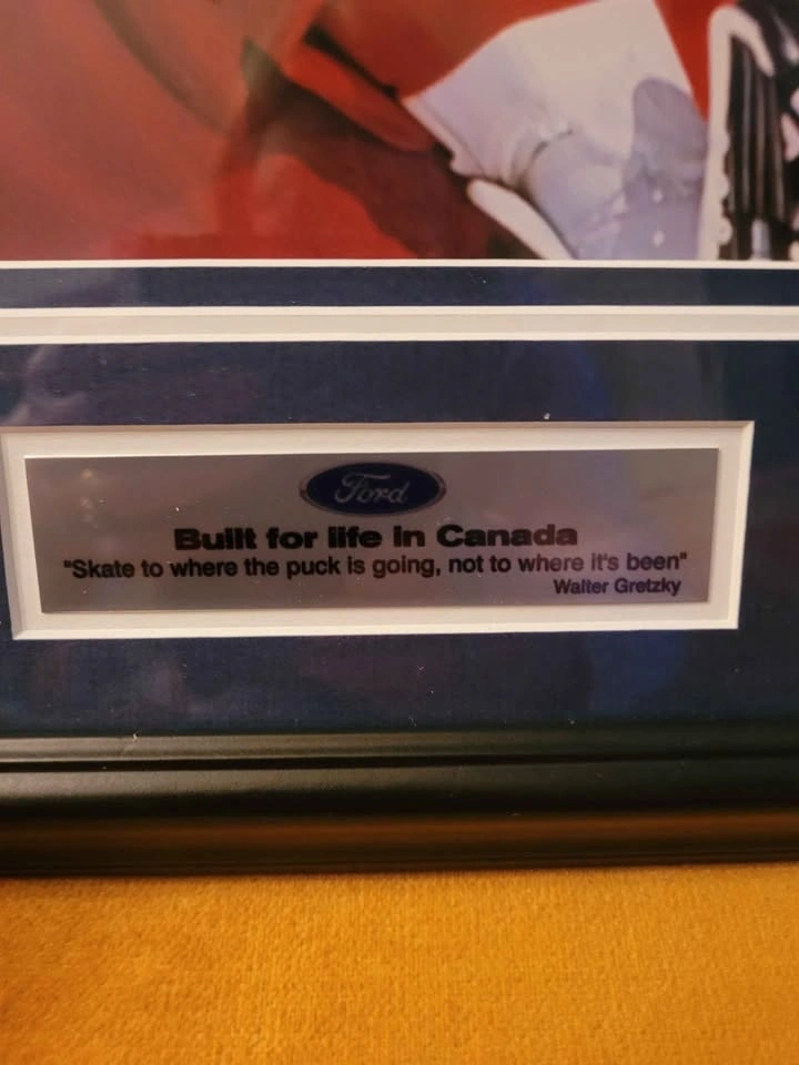 Rare Wayne Gretzky Ford Canada Commemorative Photo/Print Edition with 2 Pins and centre plate featuring Walter Gretzky quote "Skate to where the puck is going, not to where it's been." Professionally Framed and Matted Under Glass. Frame measures 20 inches X 18 inches. Beautiful piece, some small tears in the outer brown back paper on the back side. Overall in excellent condition. Ready to be hung. Pickup in the Garden and Burns area, Whitby.