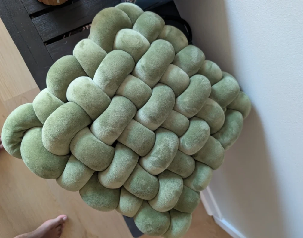 This decorative pillow features a soft, woven design in a sage green hue. Its unique braided construction adds a cozy texture to any living space. Plush and comfortable.