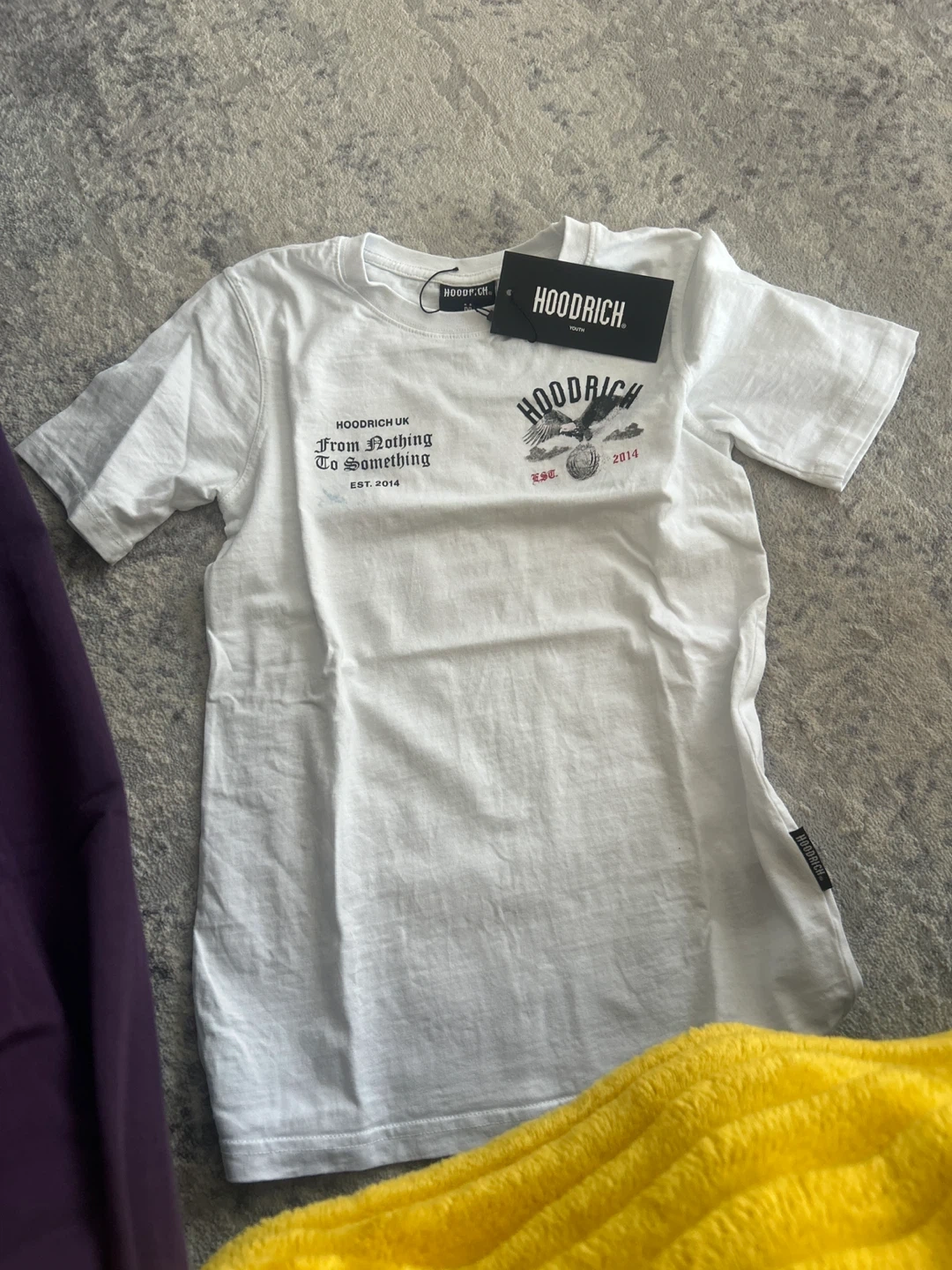 This is a white Hoodrich t-shirt and a pair of white joggers. The t-shirt has a graphic print of an eagle and globe on the back. The joggers also feature a graphic and branding. Both items are from Hoodrich UK.