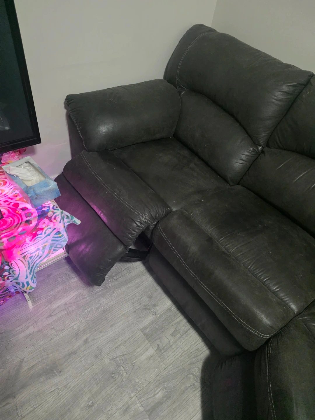 This sectional double recliner sofa is upholstered in a dark grey material with contrasting white stitching. It features multiple reclining seats, built-in cup holders, and a centre console with storage. The sofa offers ample seating and comfort for a living room space.