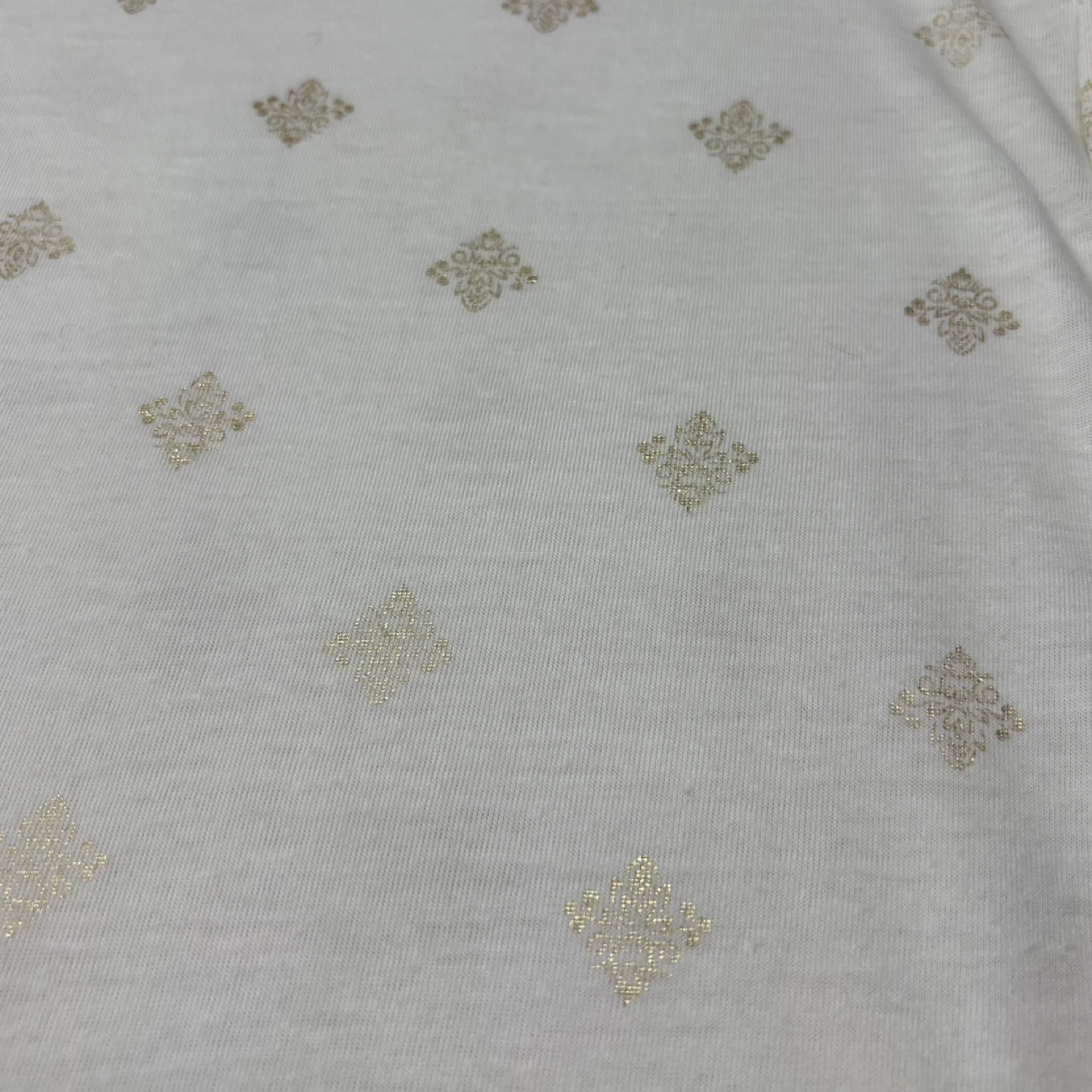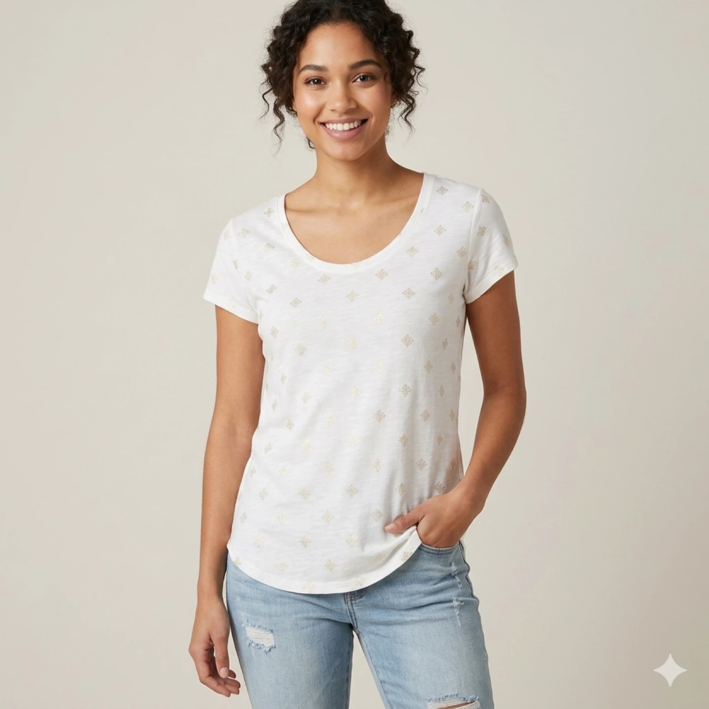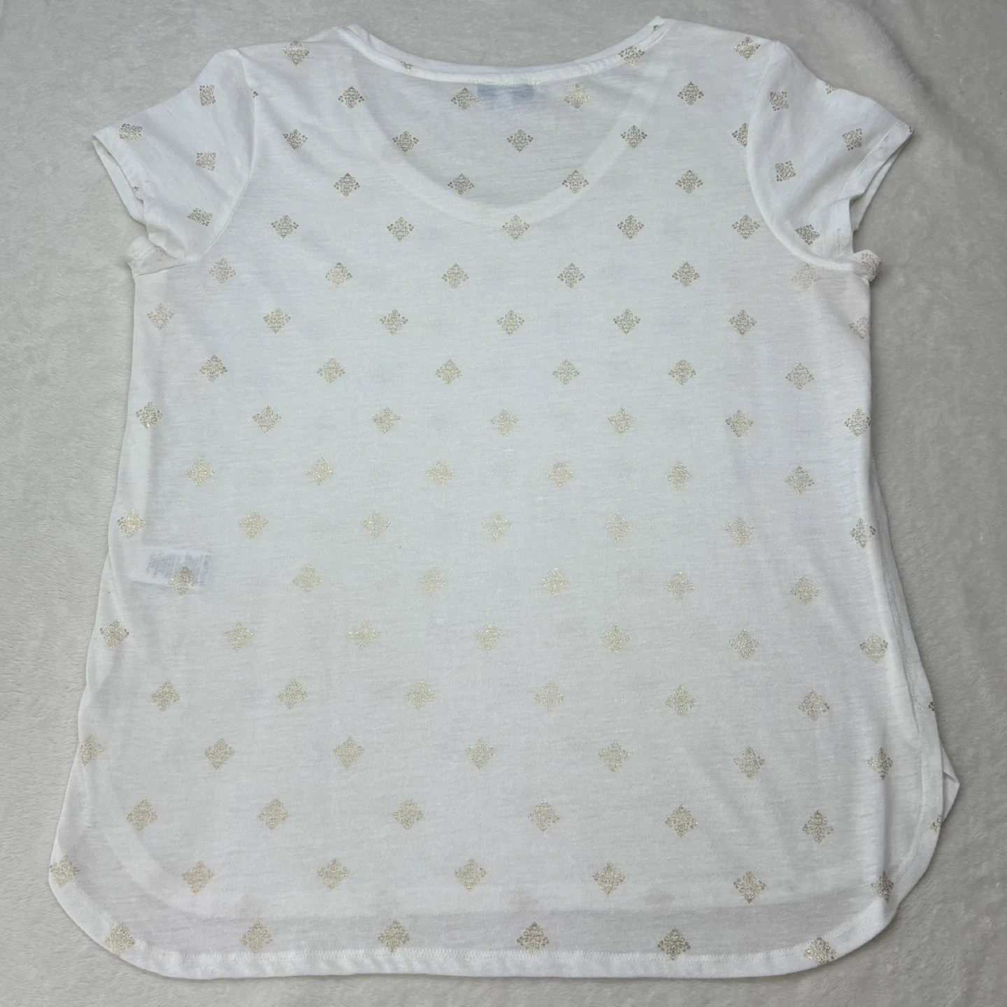Lightweight and airy white t-shirt featuring an all-over gold foil metallic medallion print. This top offers a comfortable relaxed fit with a flattering scoop neck and high-low curved hem. Crafted from a soft breathable polyester and linen blend perfect for warm weather styling.