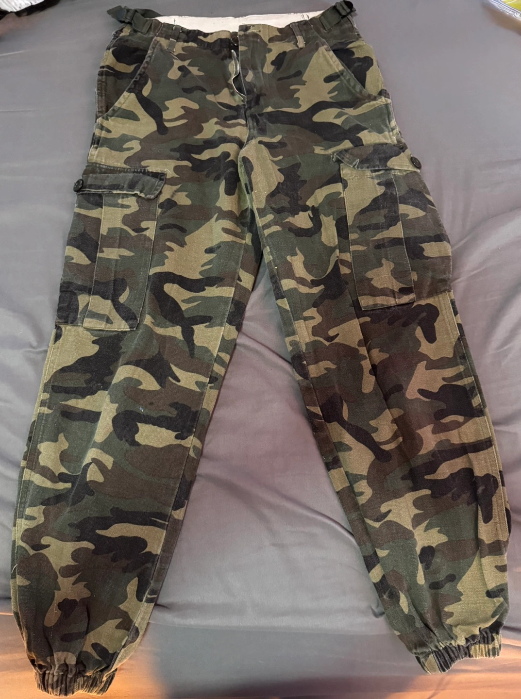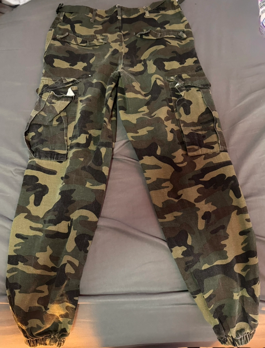 Women's camouflage cargo pants. Features multiple pockets and an elastic waistband. Great for casual wear.