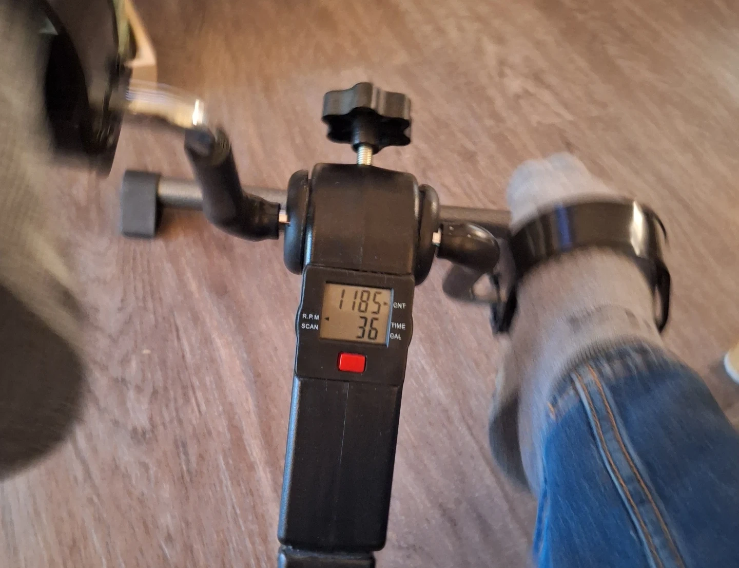 This compact pedal exerciser is great for at-home workouts. It features a digital display showing R.P.M., time, and count. It's made of durable metal construction.
