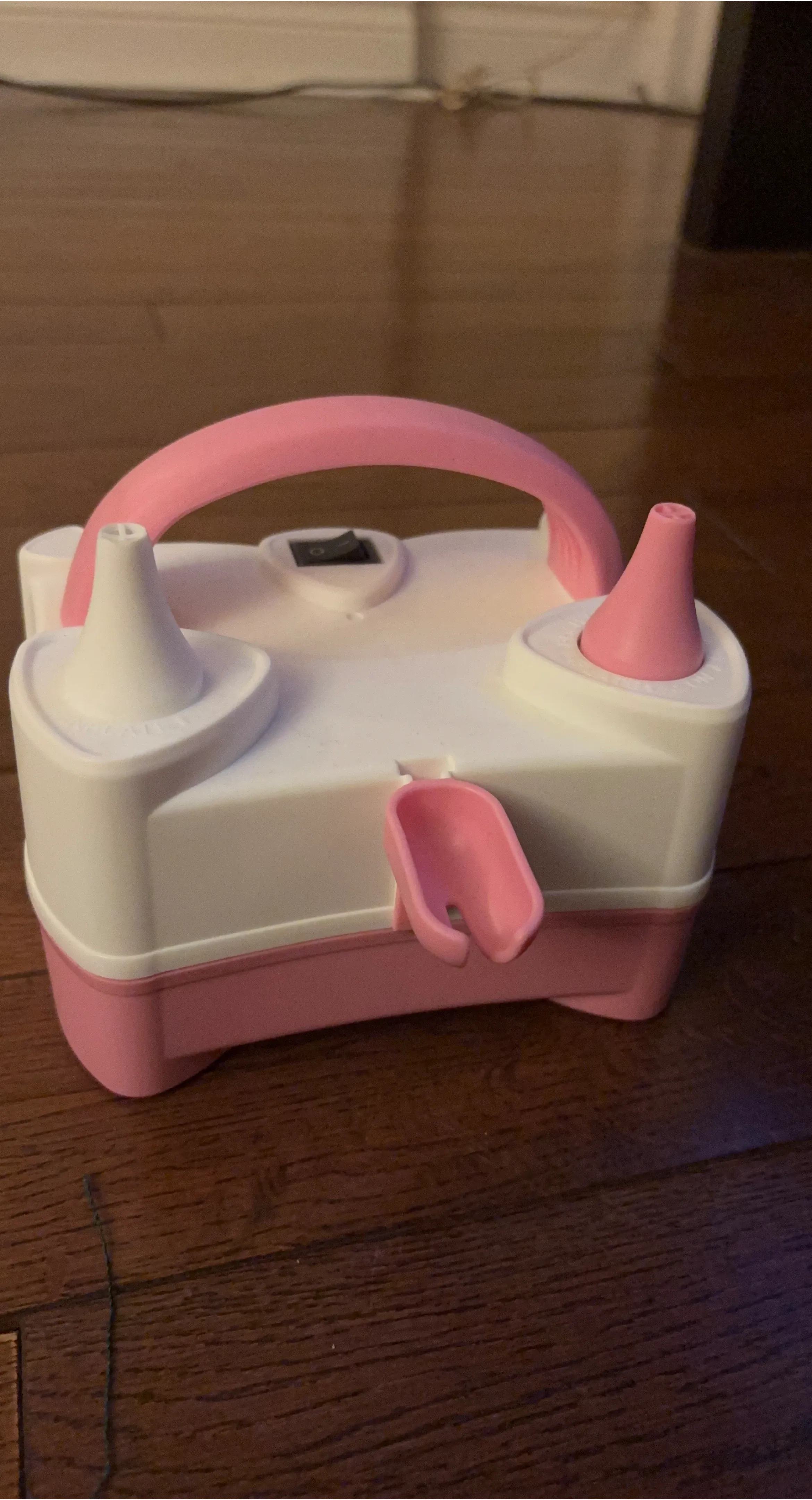 This portable electric balloon pump inflator makes decorating for parties a breeze! It's designed with two nozzles for quick inflation. The unit includes a convenient storage compartment for the power cord.