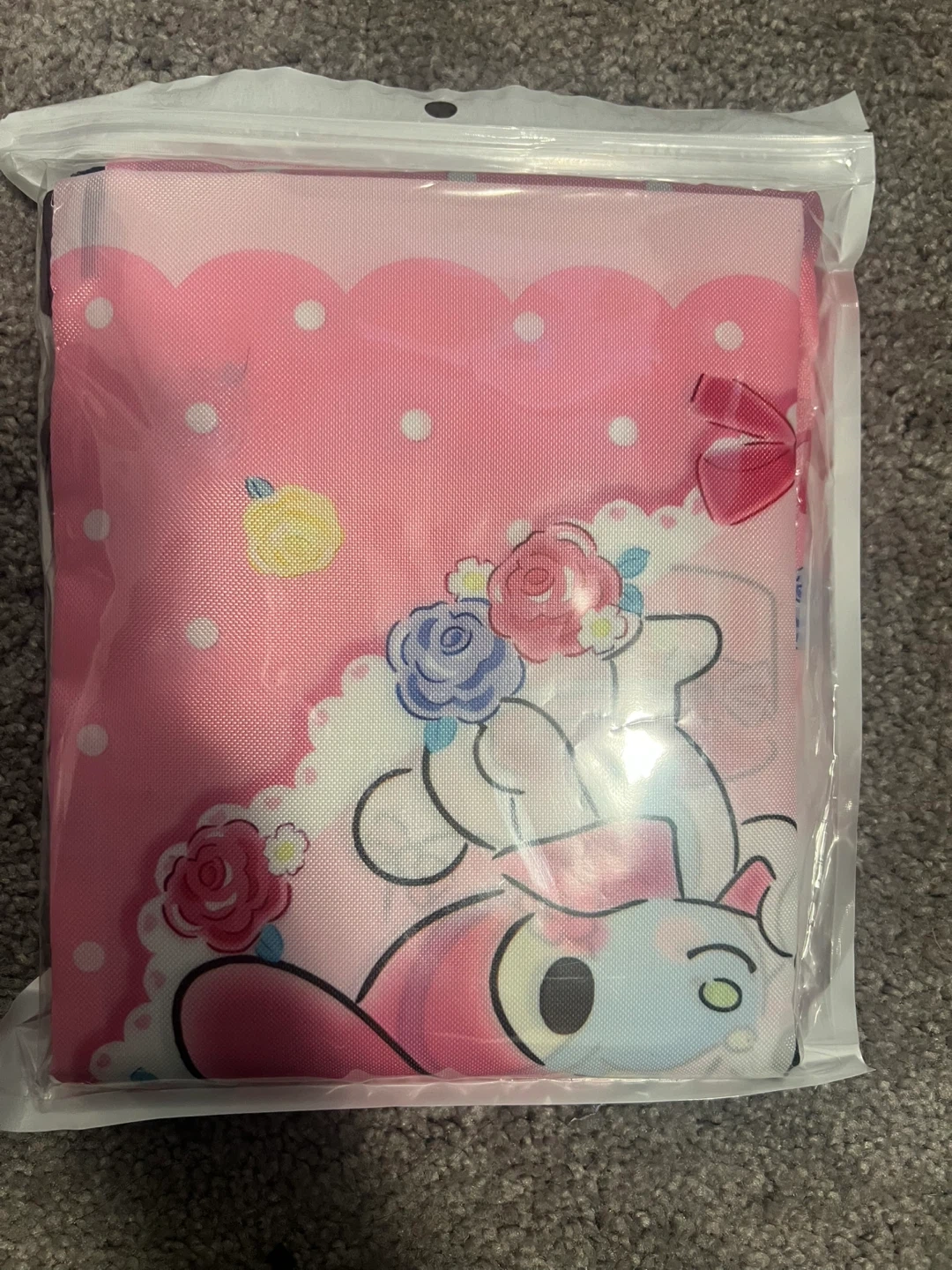 This set features a pink My Melody drawstring bag with floral accents. It also includes a matching coin purse and lanyard with charms. Perfect for fans of Sanrio!