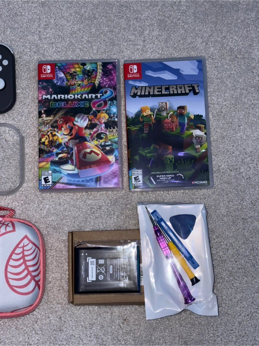 This switch has NO stick drift, very very minor use, under 90 hours used approximately, It has had a battery replaced for peace of mind, and I am providing another battery for 2-3 years down the road you would like to replace. It comes with mario cart and minecraft ($120 Value) A travelling case, a protective grip for the switch, and a new screen protector!