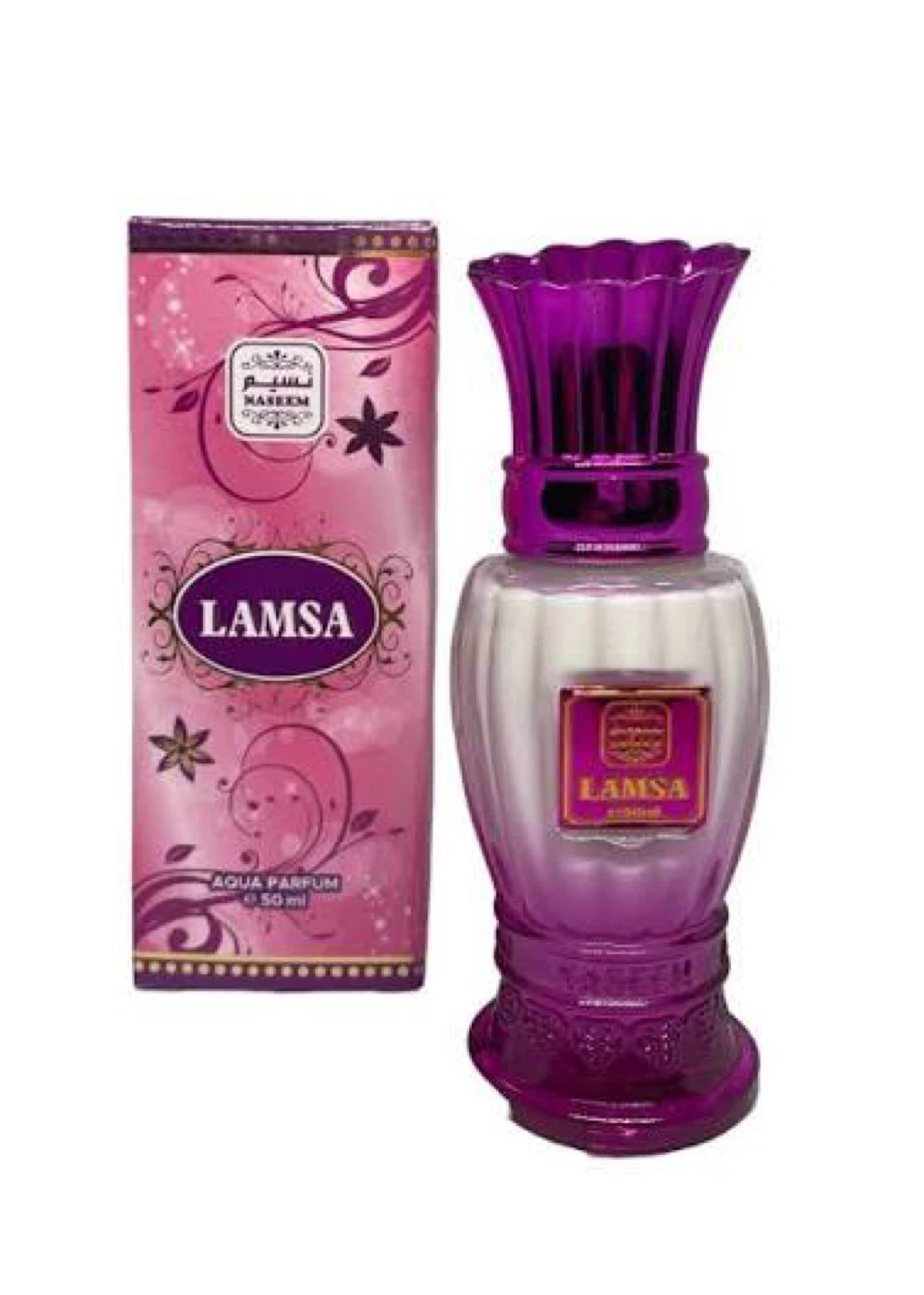 Naseem Lamsa Aqua Parfum is a 50ml bottle of fragrance. It comes in an elegant purple and clear glass bottle with a decorative cap. The scent is described as an aqua parfum.