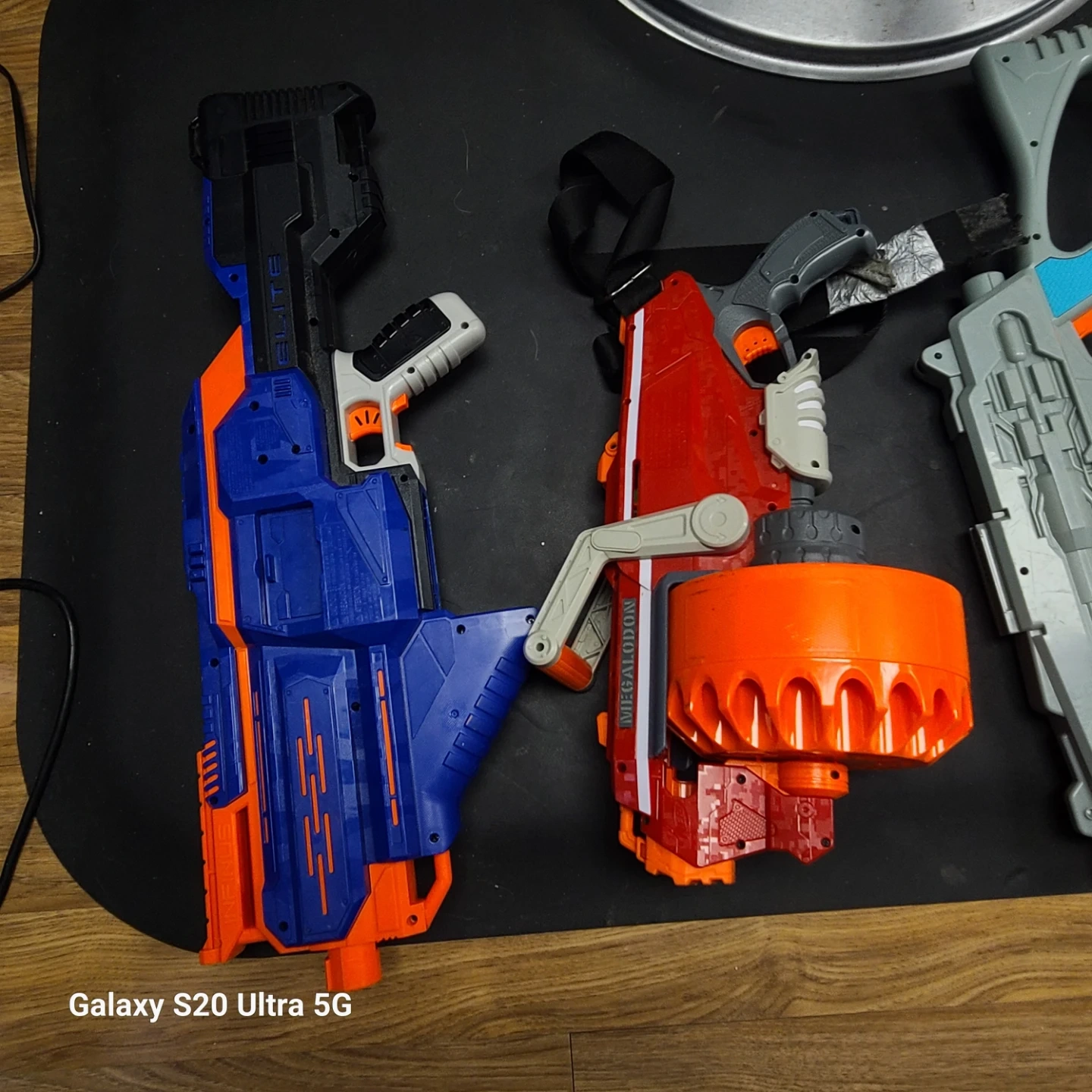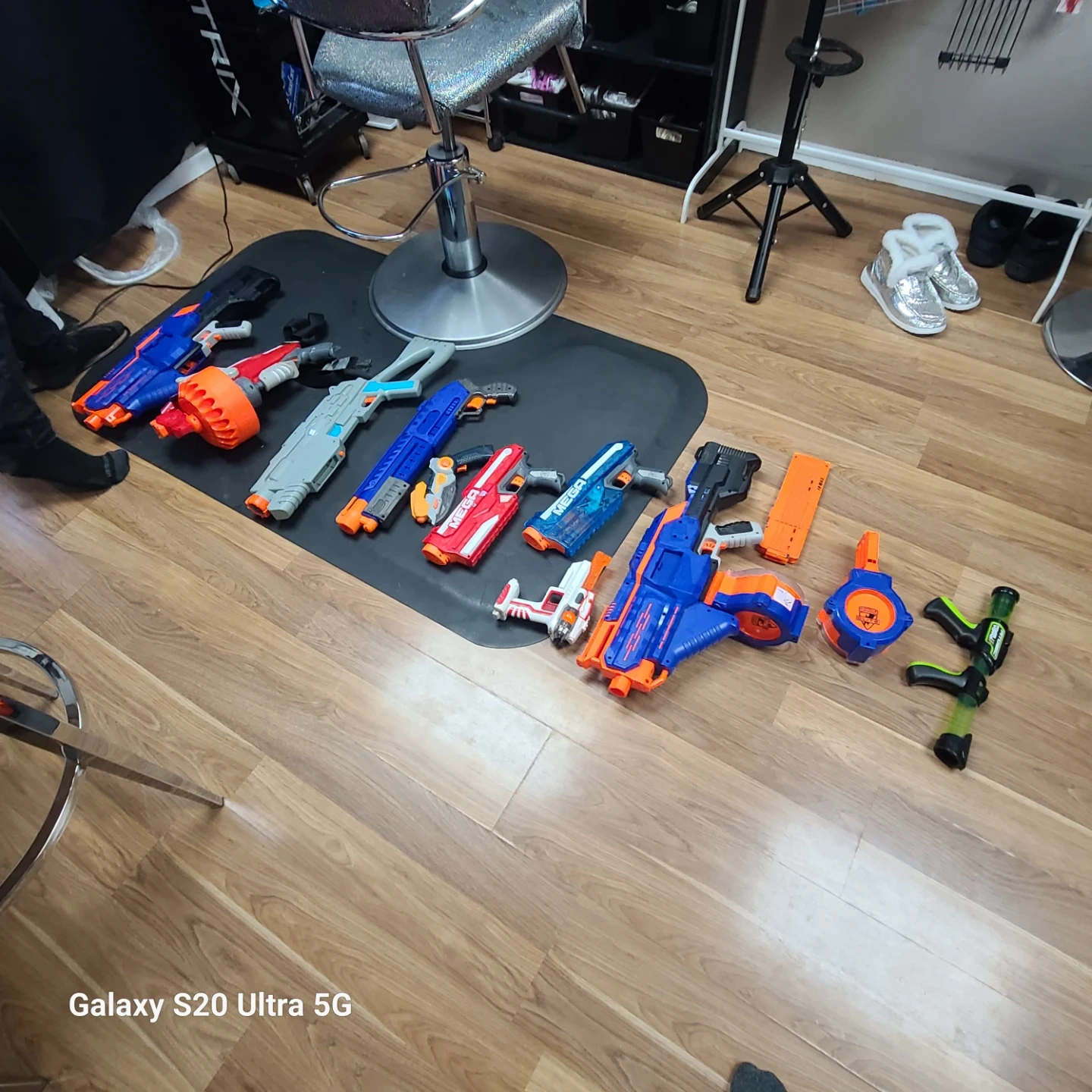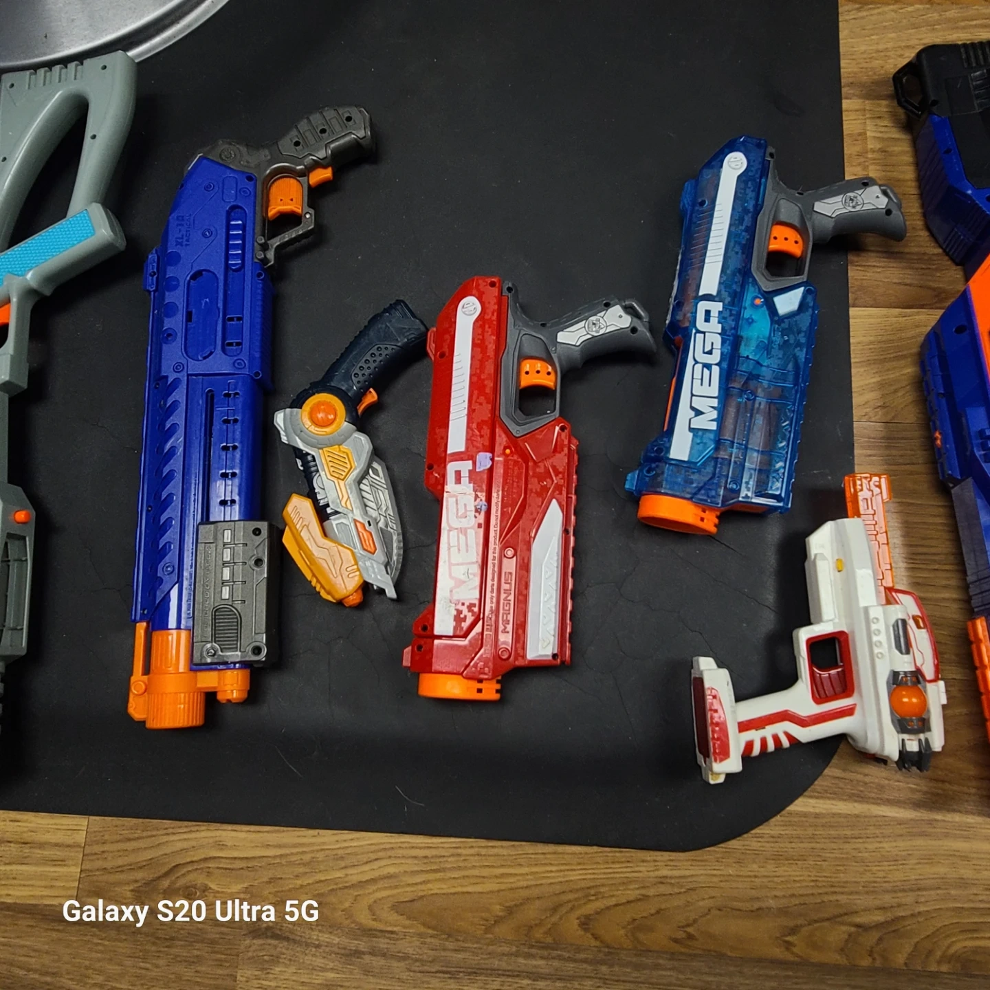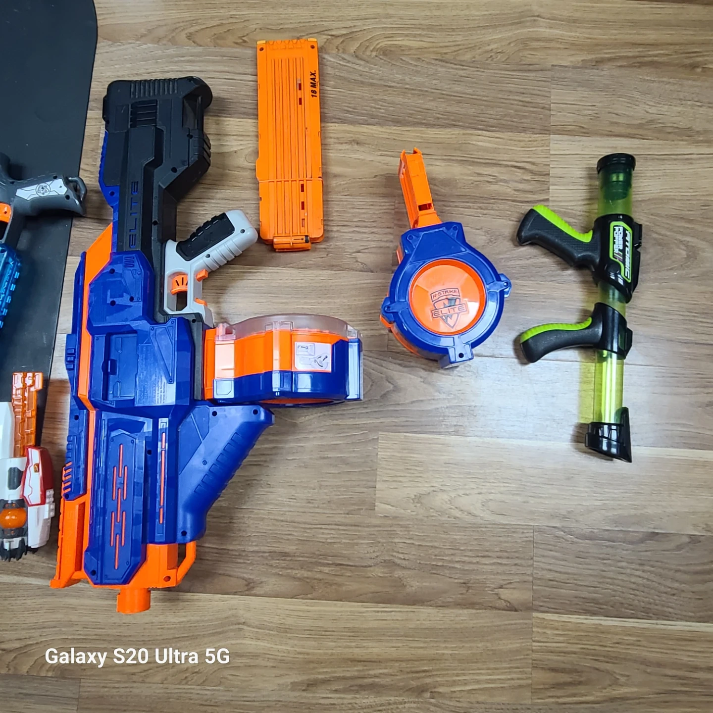 Collection of assorted Nerf blasters and accessories. Includes multiple blasters, drum magazines, and a large capacity magazine.