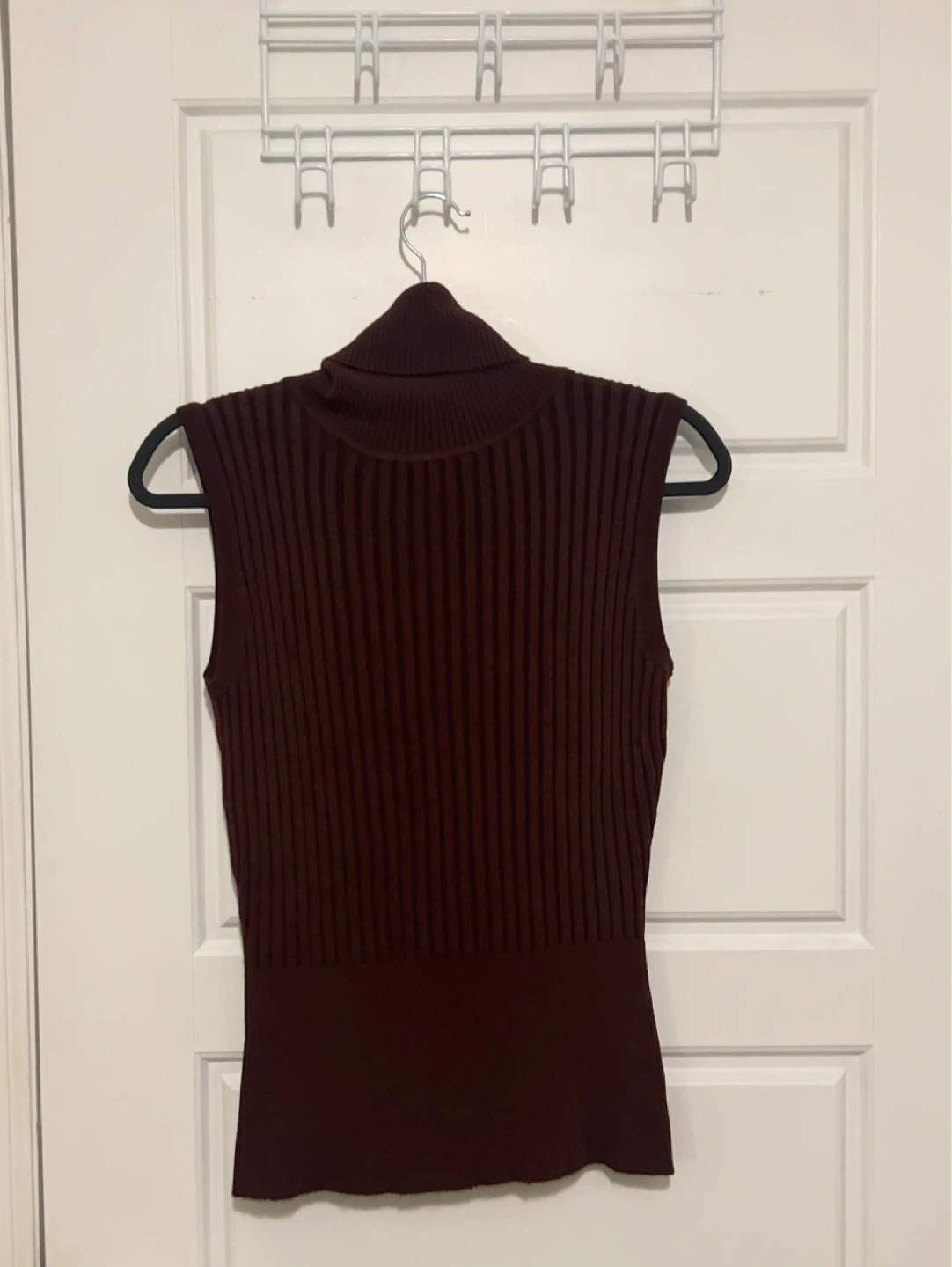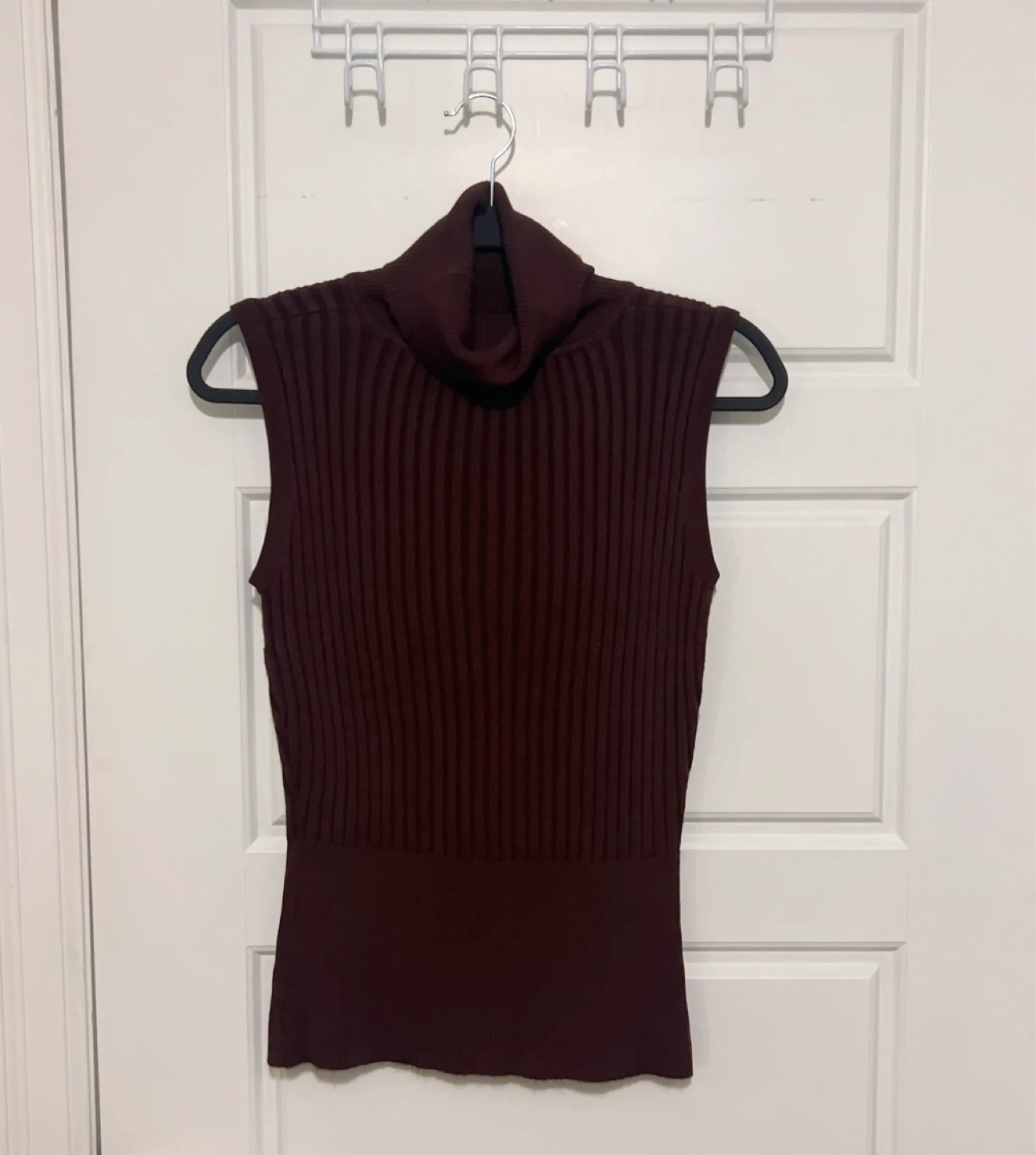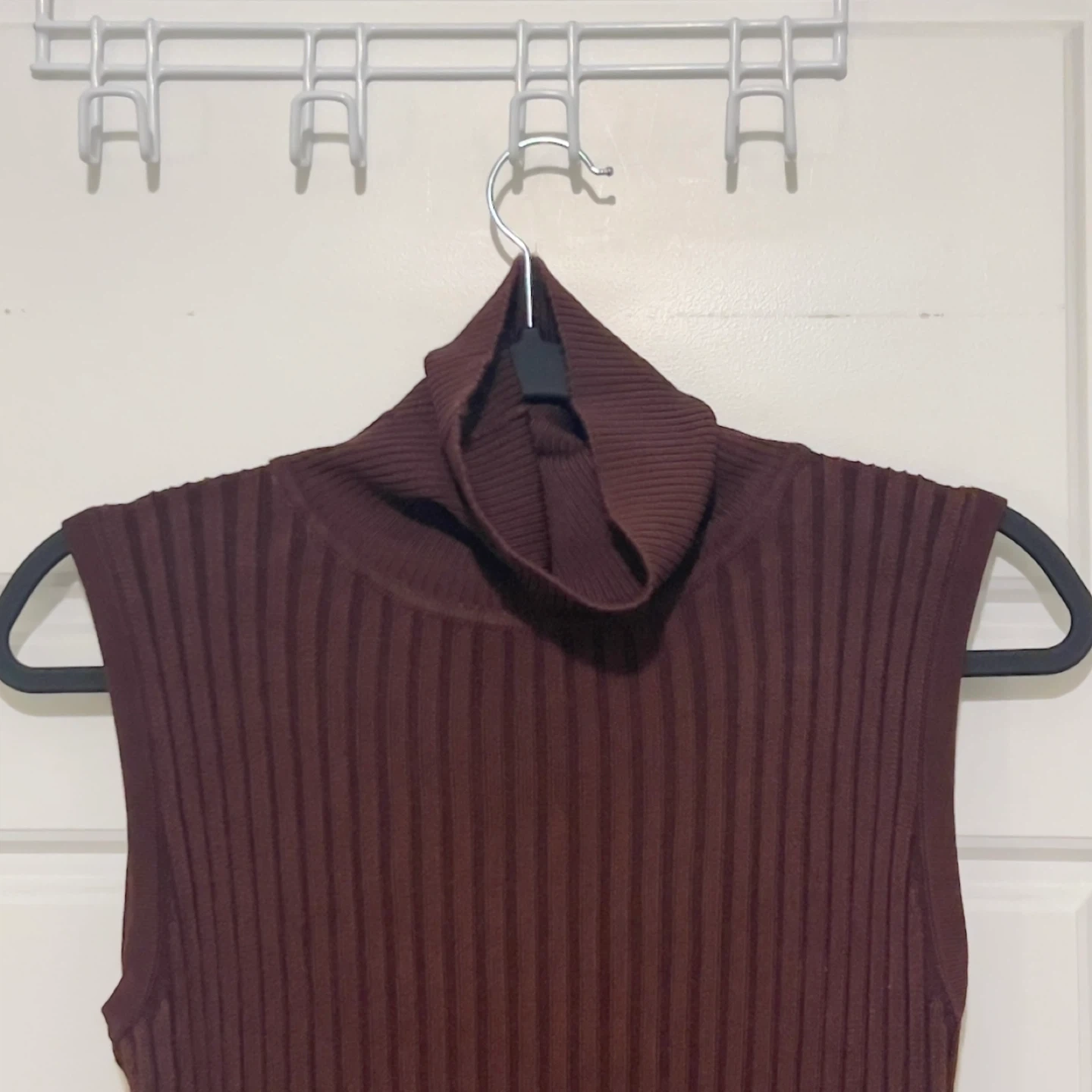 A sleeveless turtleneck top in a rich brown colour. It's made of a ribbed stretchy knit material. Perfect for layering or wearing on its own!