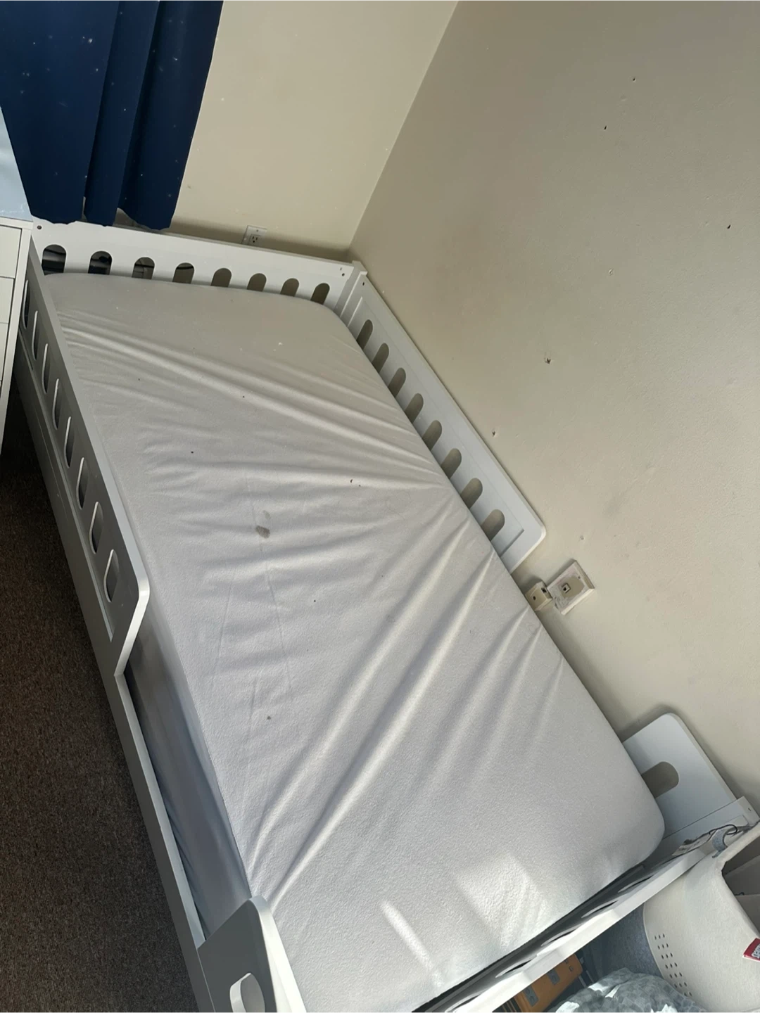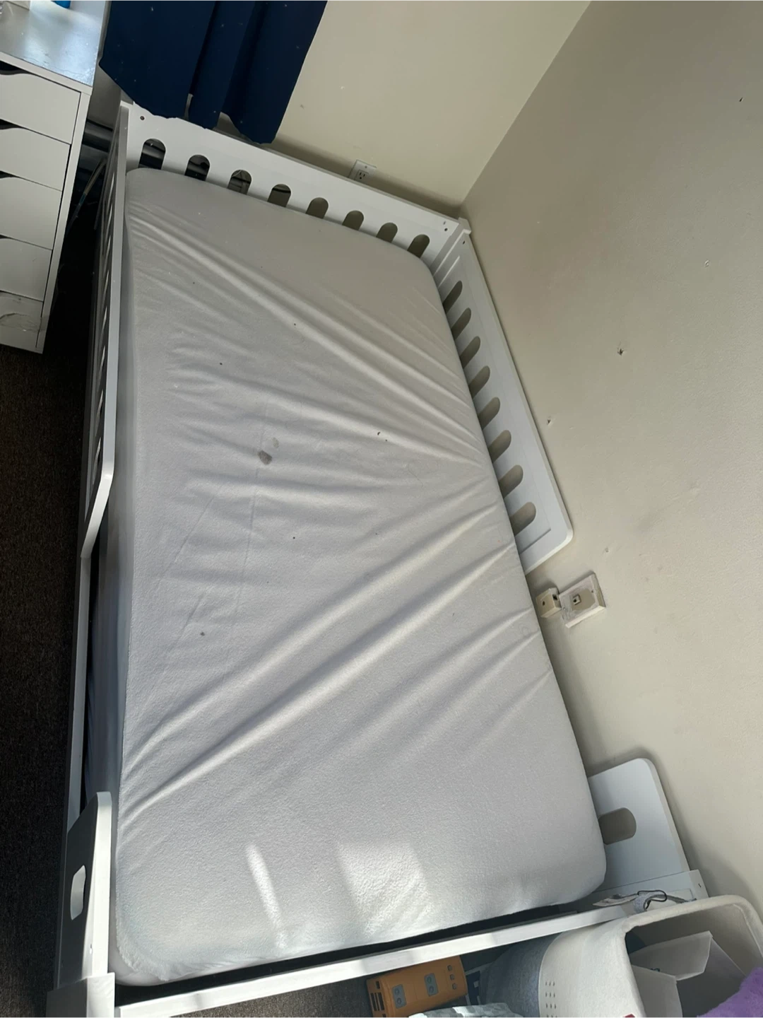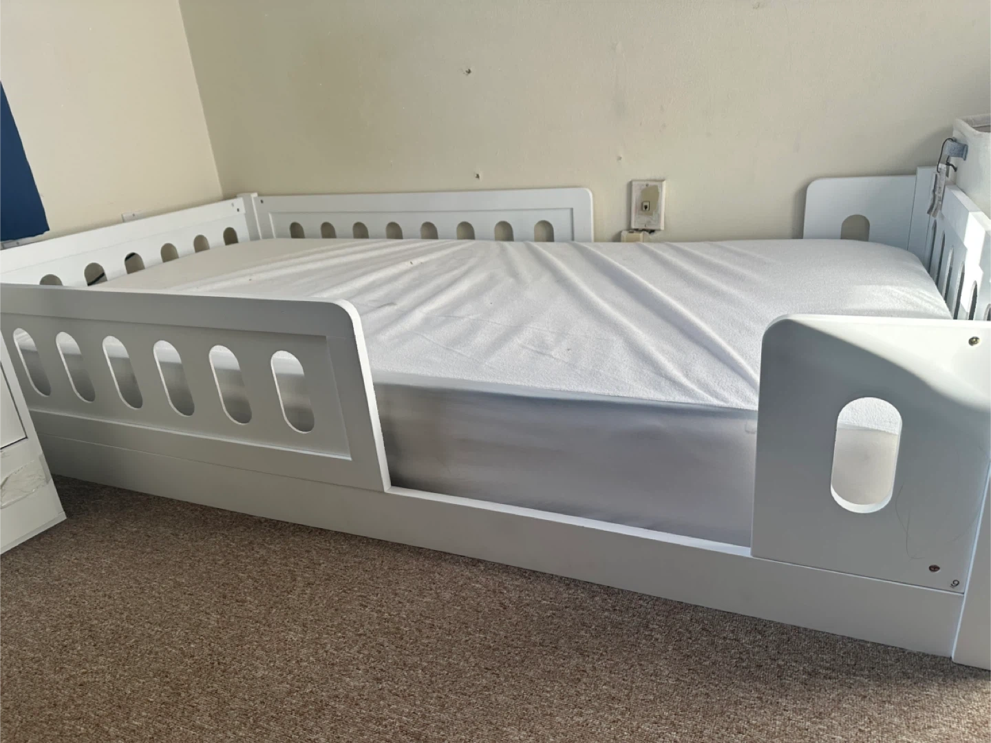 This white toddler bed features protective side rails. It's designed for a twin-sized mattress. Wood construction. Frame only!