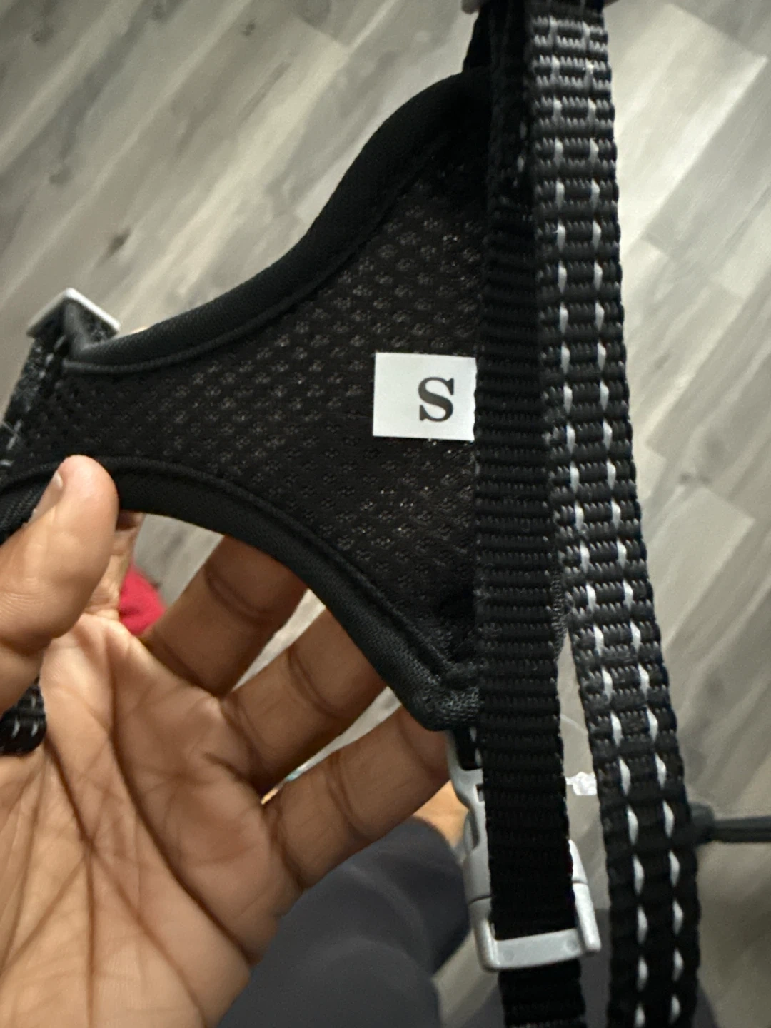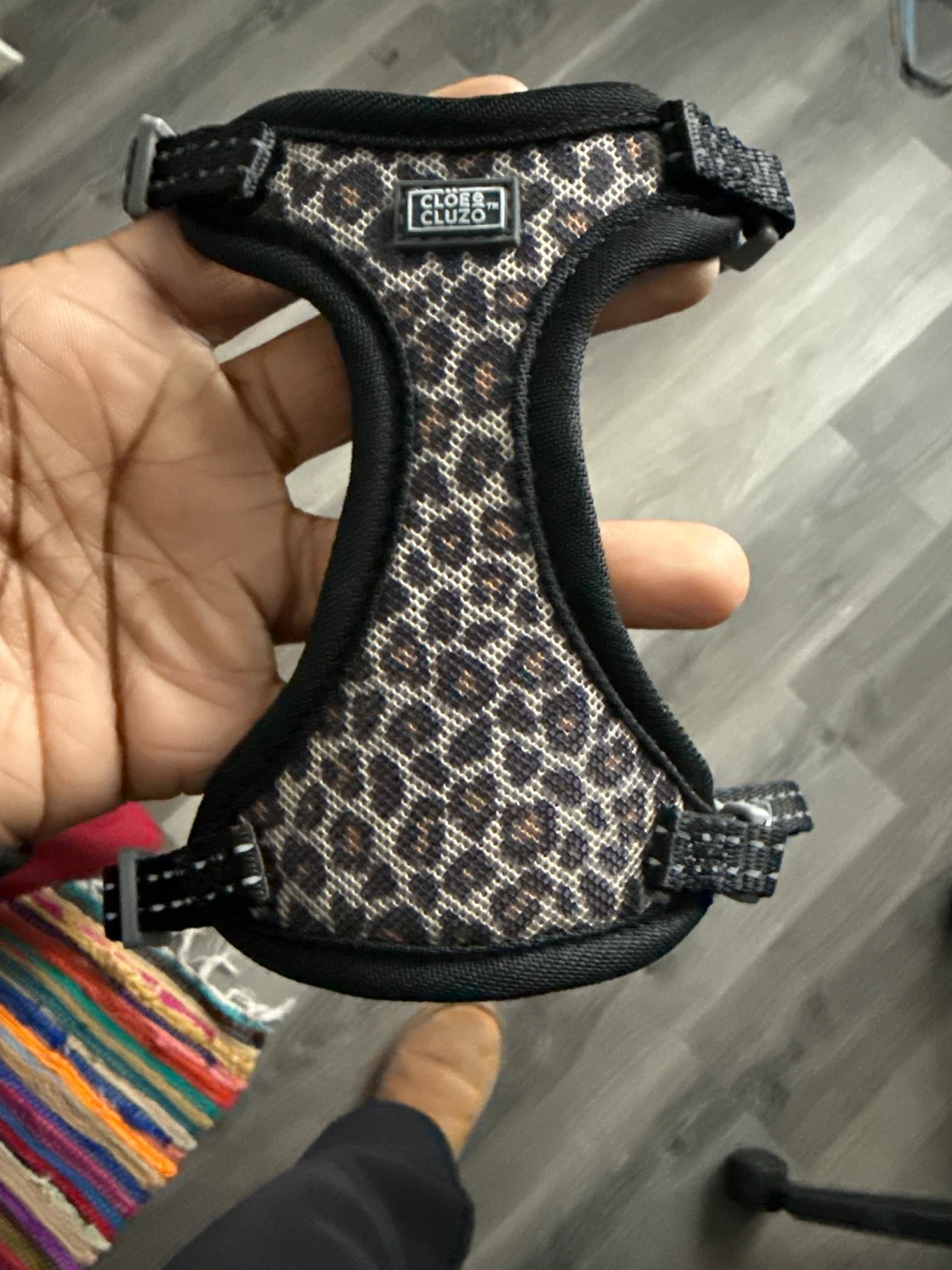 This black and leopard print kitten harness is size small. It features a breathable mesh material with adjustable straps for a comfortable fit. It's perfect for walks with your small indoor kitten!