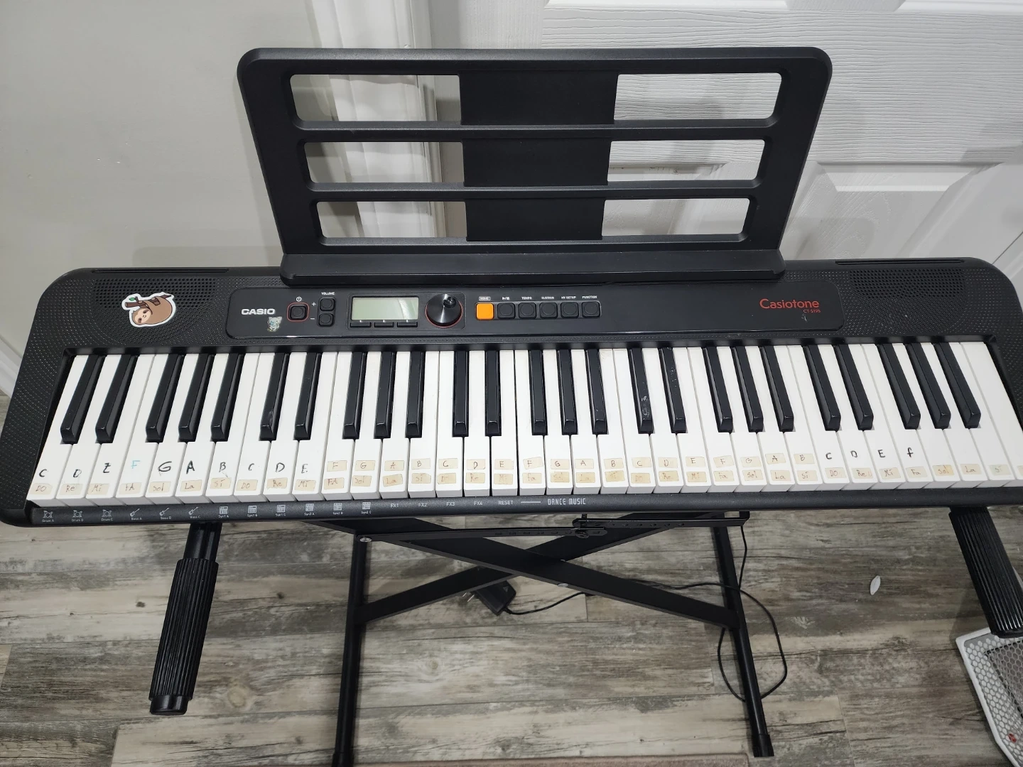 Casio Casiotone CT-S195 keyboard. Includes music stand and power adapter. Keys have stickers to help with learning. Great for beginners getting into music!