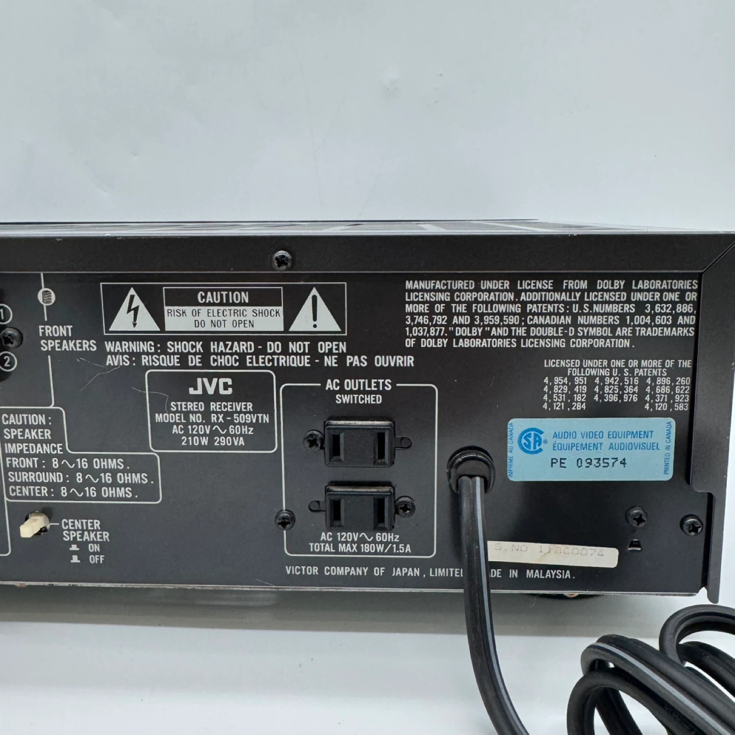 JVC RX-509VTN Digital Surround Stereo Receiver Dolby Pro Logic