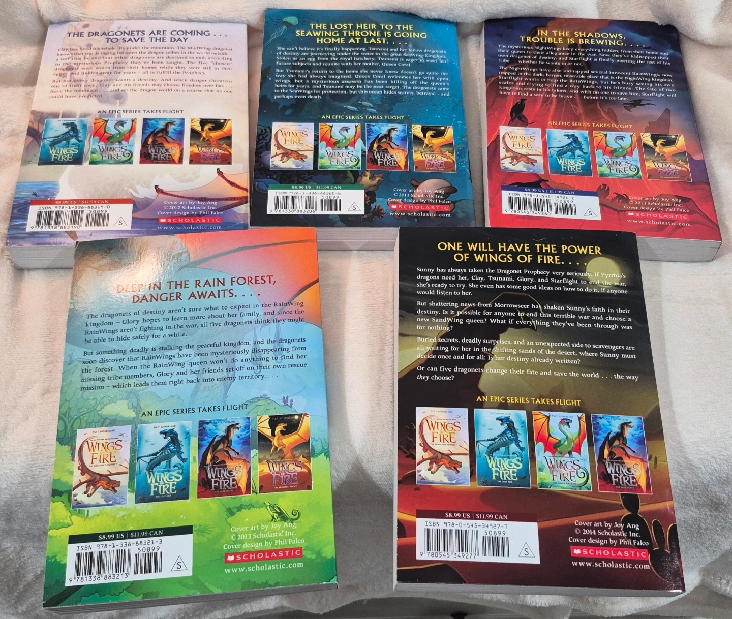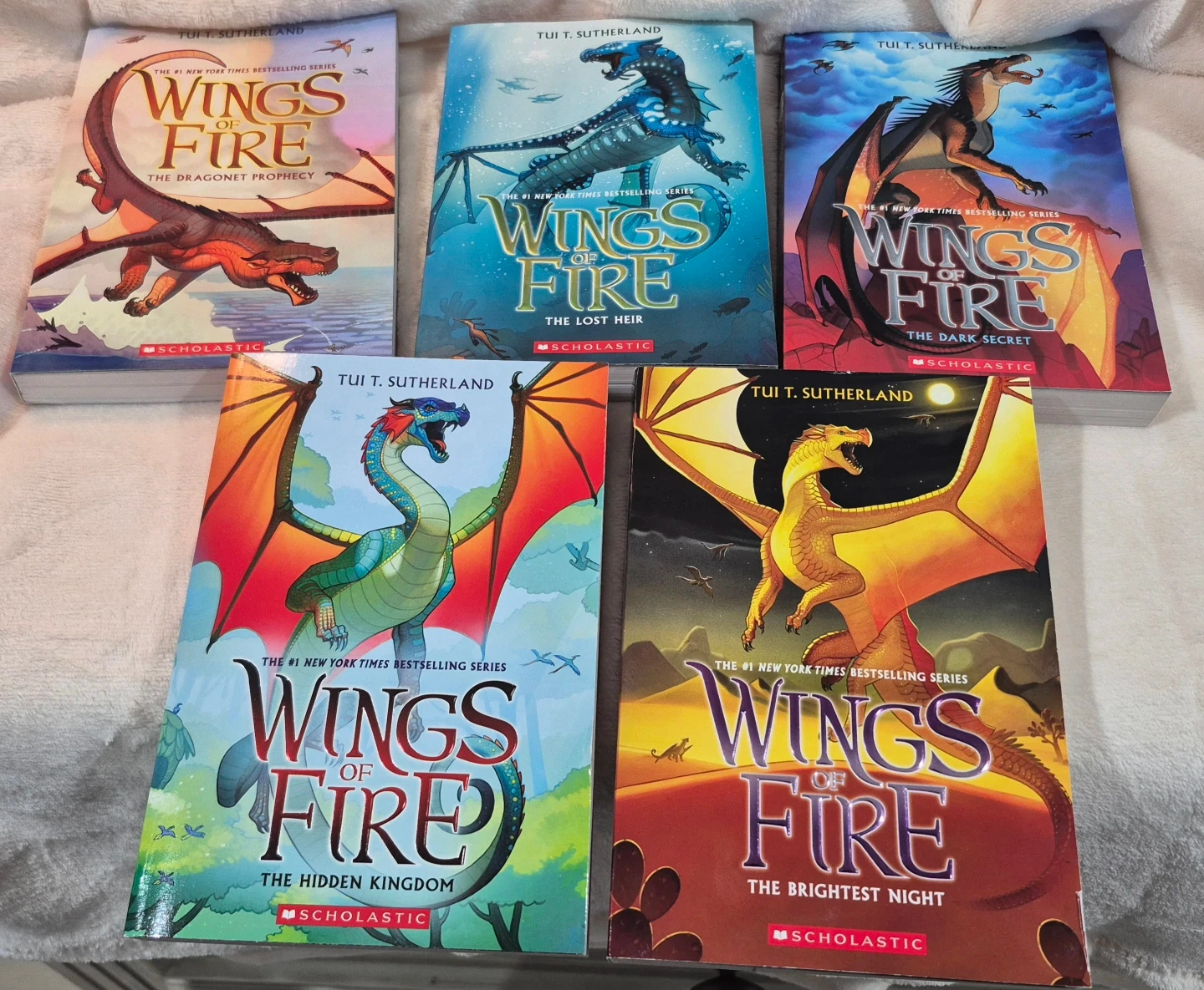 This is a collection of five books from the Wings of Fire series by Tui T. Sutherland. Books included are The Dragonet Prophecy, The Lost Heir, The Dark Secret, The Hidden Kingdom, and The Brightest Night. These books are great for young readers who enjoy fantasy and adventure stories.