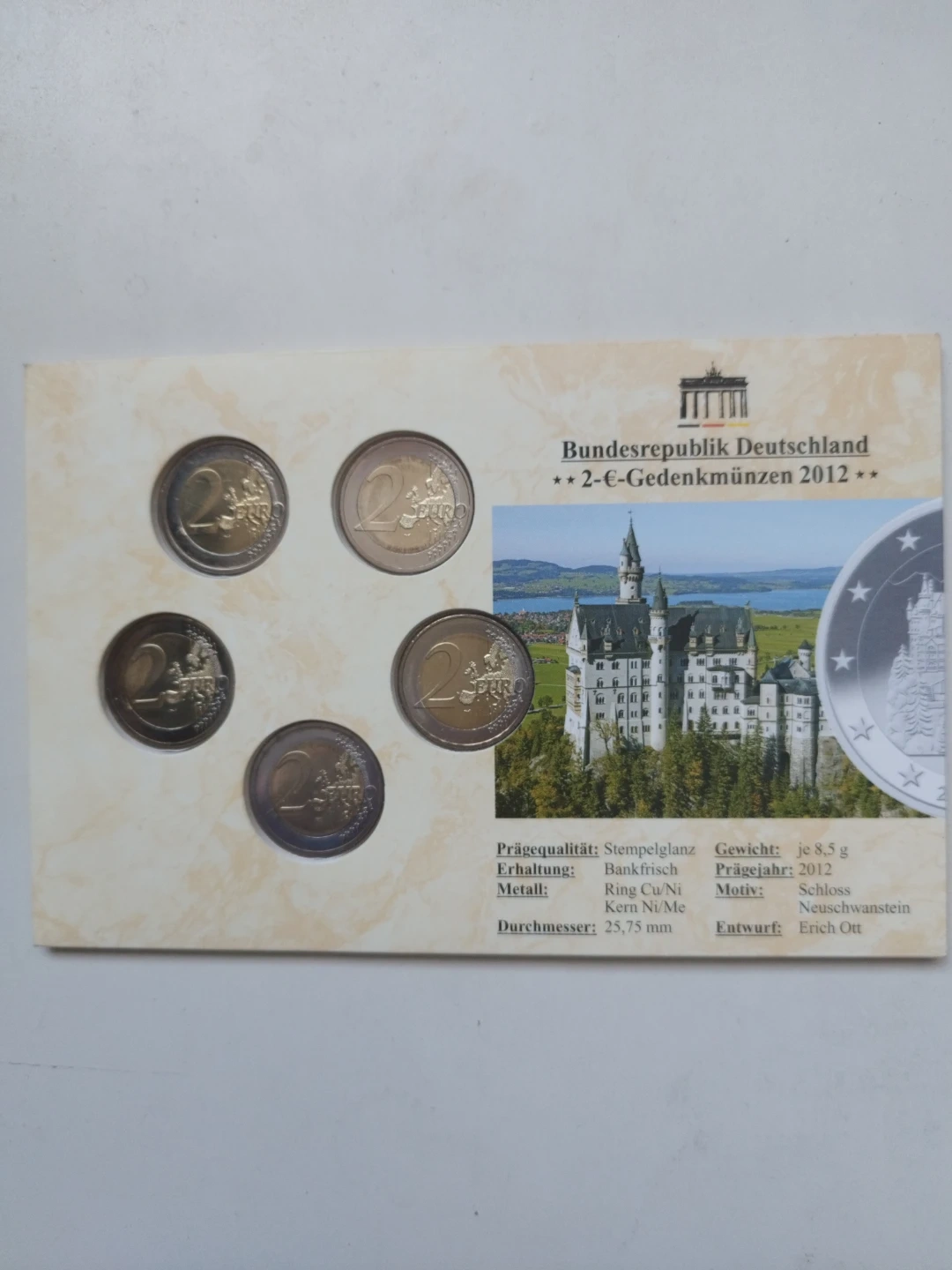 This set features four 2 Euro commemorative coins from Germany from 2012, highlighting Neuschwanstein Castle in Bavaria. Each coin has a diameter of 25.75 mm and a weight of 8.5 g. The coins are from the 'Bundesrepublik Deutschland 2-€-Gedenkmünzen 2012' series. They are presented in a card with images of the castle and map of Germany.