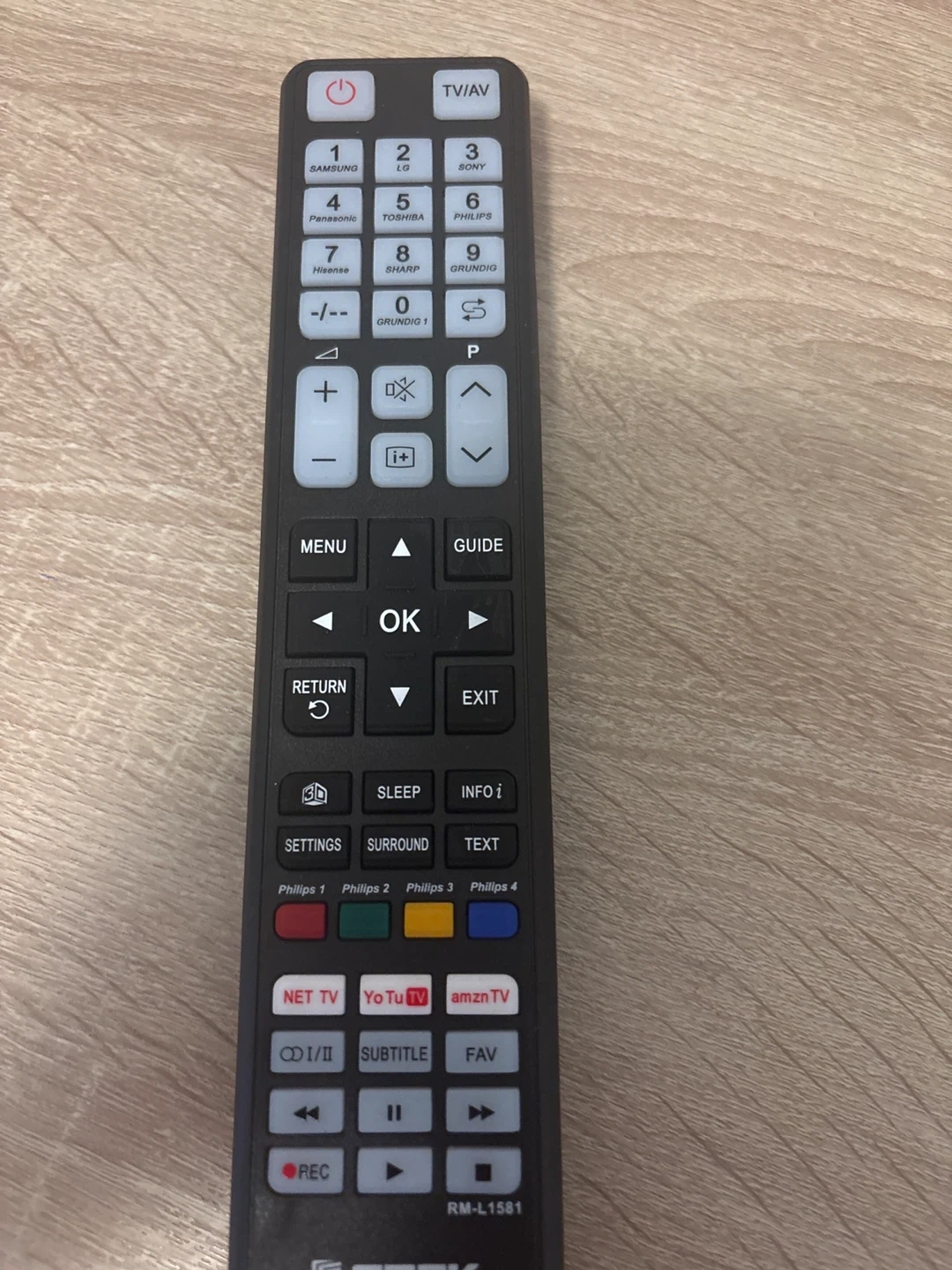 This is a GTEK universal remote, model RM-L1581. It's designed for LCD and LED TVs. Supports multiple brands like Samsung, LG, Sony, and more.