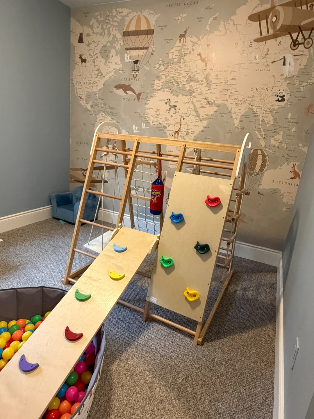 Super fun indoor climbing gym for kiddos. Wooden structure has slide, rock climbing wall, rope ladder, and swing. Comes with ball pit full of colorful balls. Great for keeping little ones active inside.