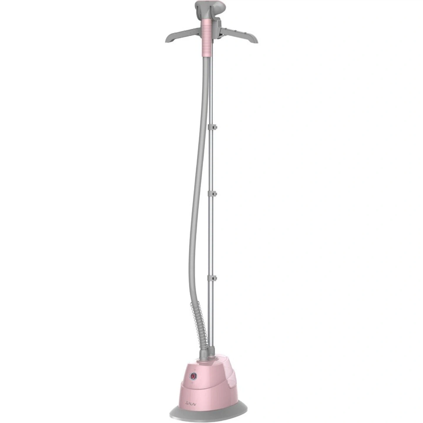 SALAV garment steamer in pink. It comes with a user manual and attachments. Included accessories: Pants Press Attachment, Fabric Brush.