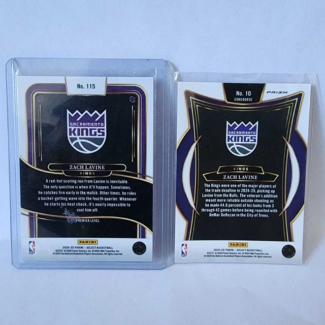 2-card Zach LaVine lot from 2024-25 Panini Select Basketball. Includes Premier Level Blue and Concourse Orange parallels in Sacramento Kings uniform. Cards are in excellent condition and were sleeved immediately after pulling. Cashless payment accepted. Cash accepted.