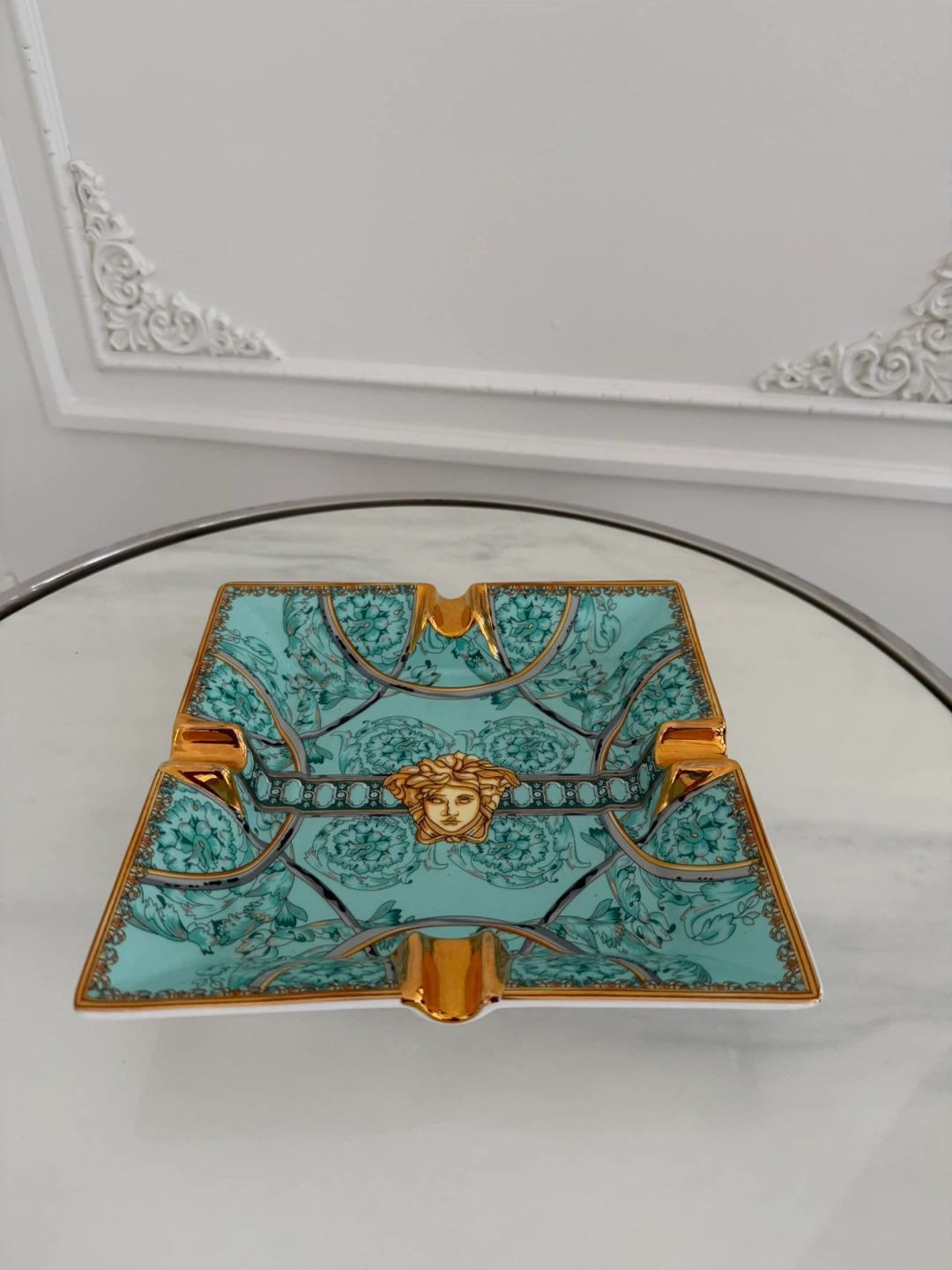 This is a decorative ashtray by Rosenthal and Versace. It features the iconic Medusa head motif and a teal and gold patterned design. Porcelain material with gold-tone accents.