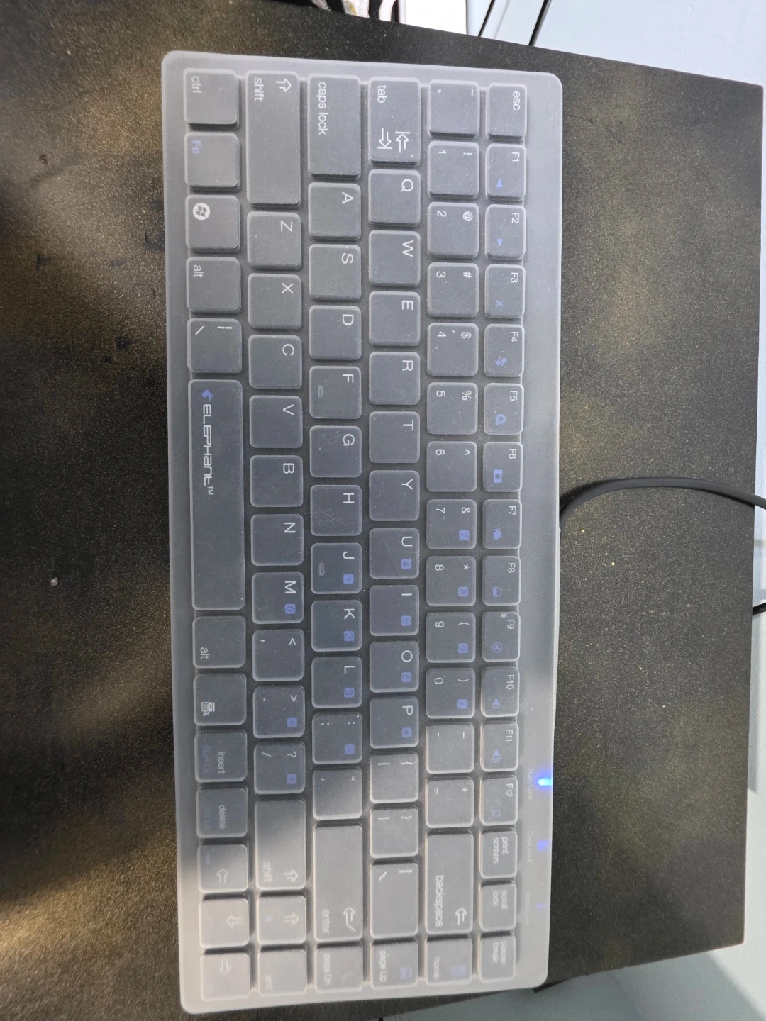 This is an ELEPHAS wireless mini keyboard. It's a compact and portable keyboard. It has a QWERTY layout with blue accented keys.