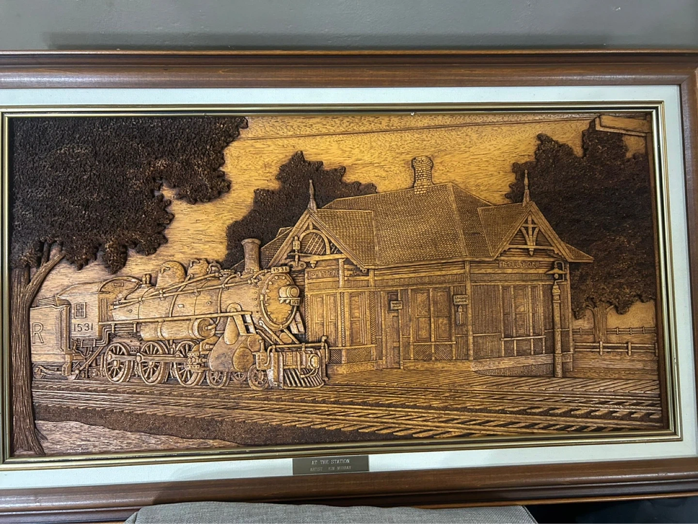 Framed Wood Carving "At The Station" by Kim Murray