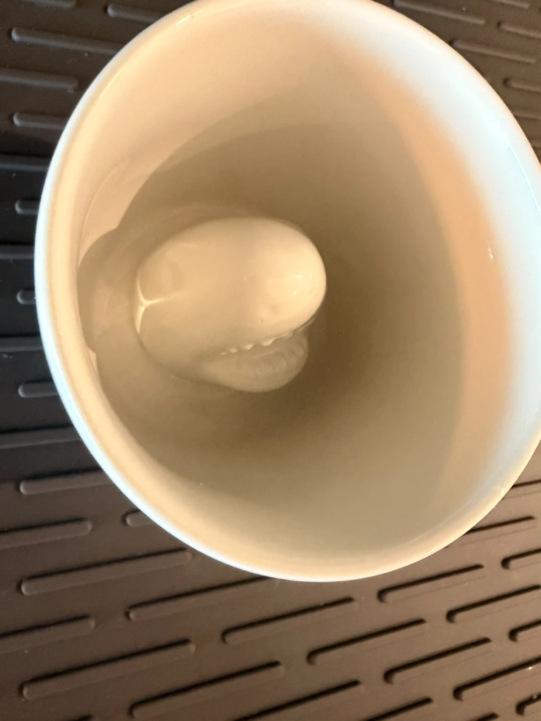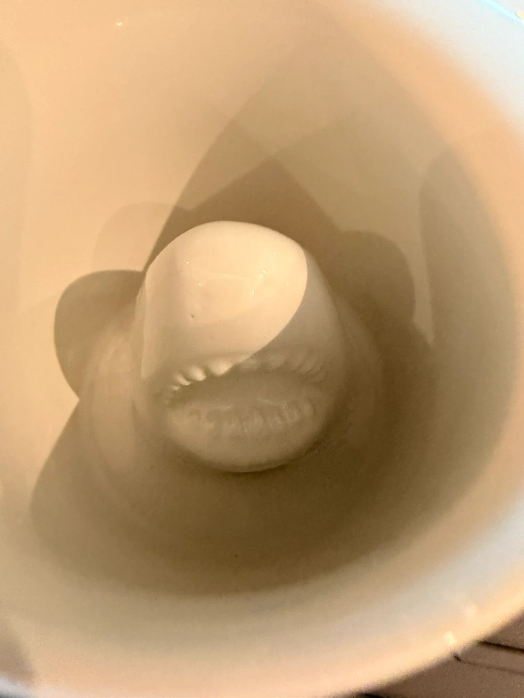 White ceramic mug featuring a novelty design with a shark's head and teeth at the bottom inside. It's made of durable ceramic material. This mug adds a bit of fun to your morning coffee or tea!