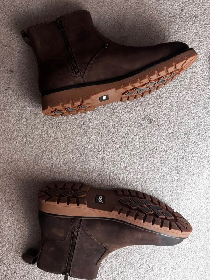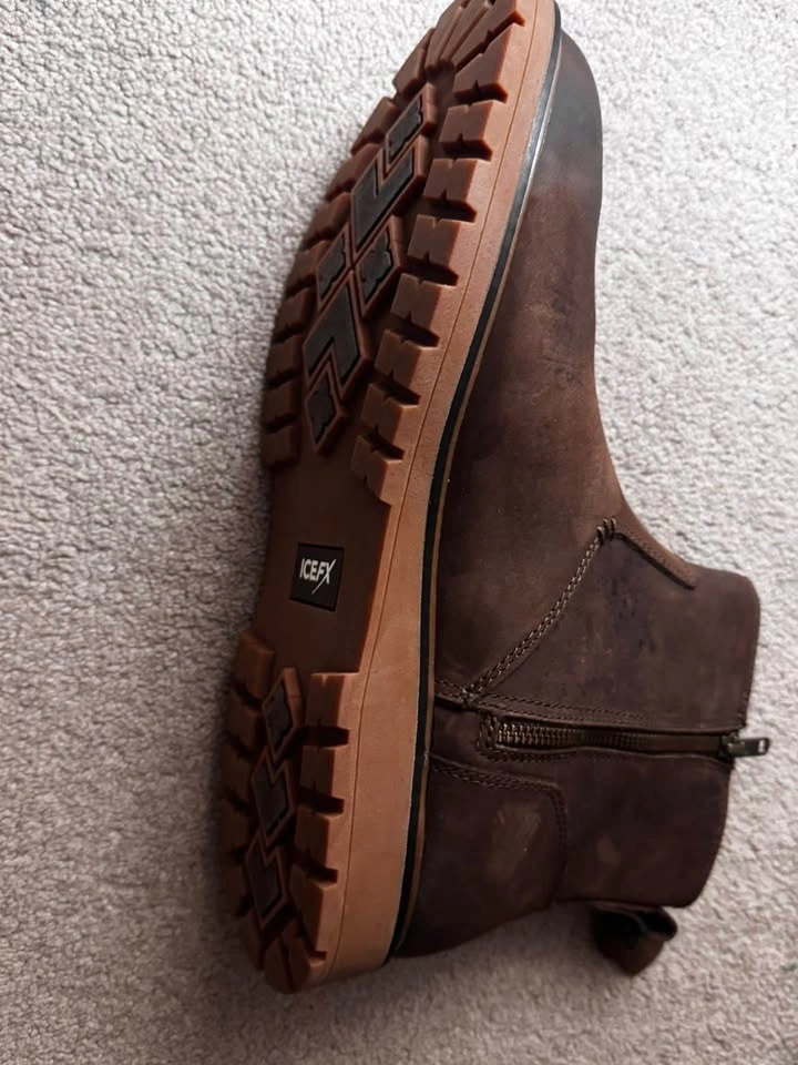 Brown ICEFx boots size 10. These have side zippers for easy on and off. Soles are chunky with good grip. Nice boots for everyday wear. Never wore them.
