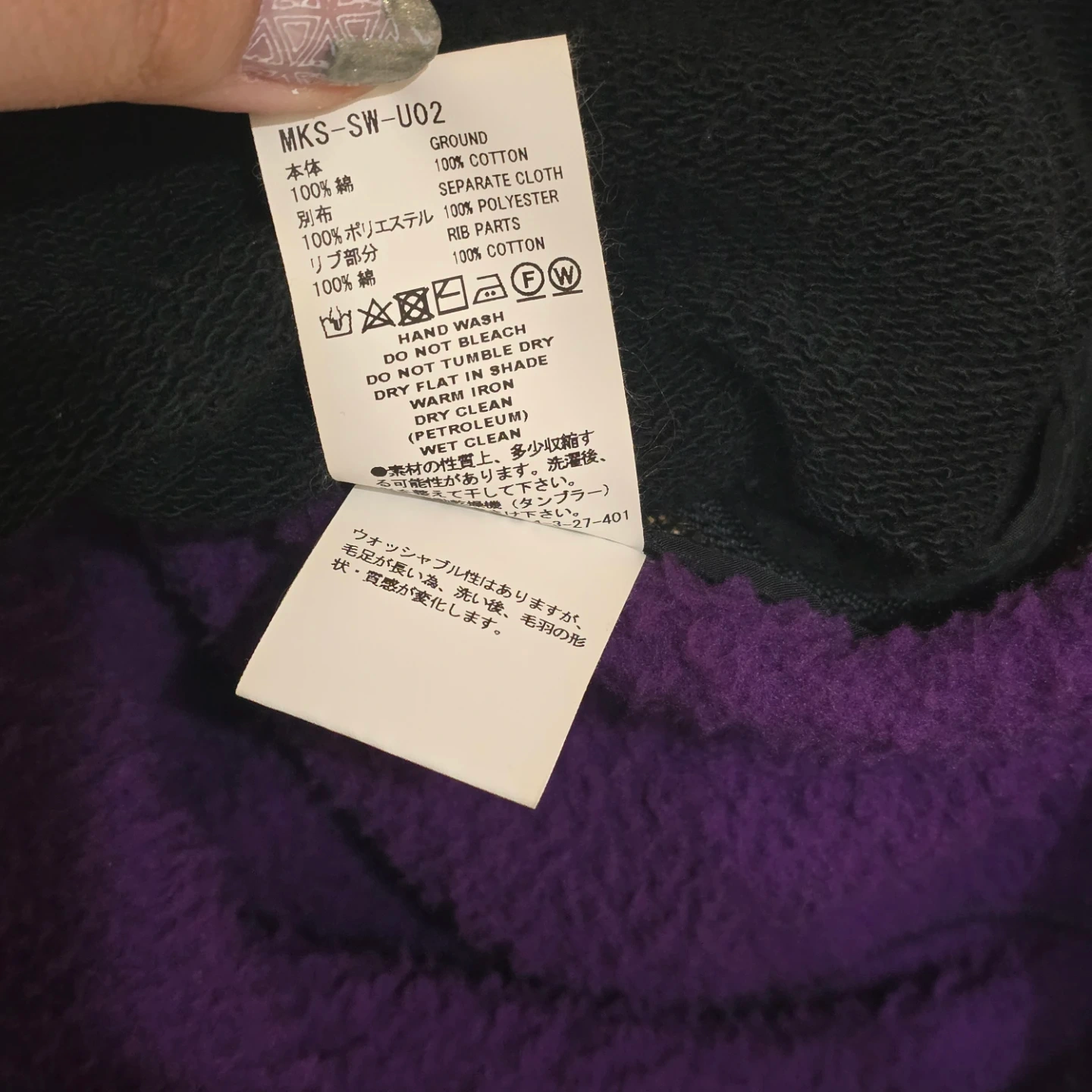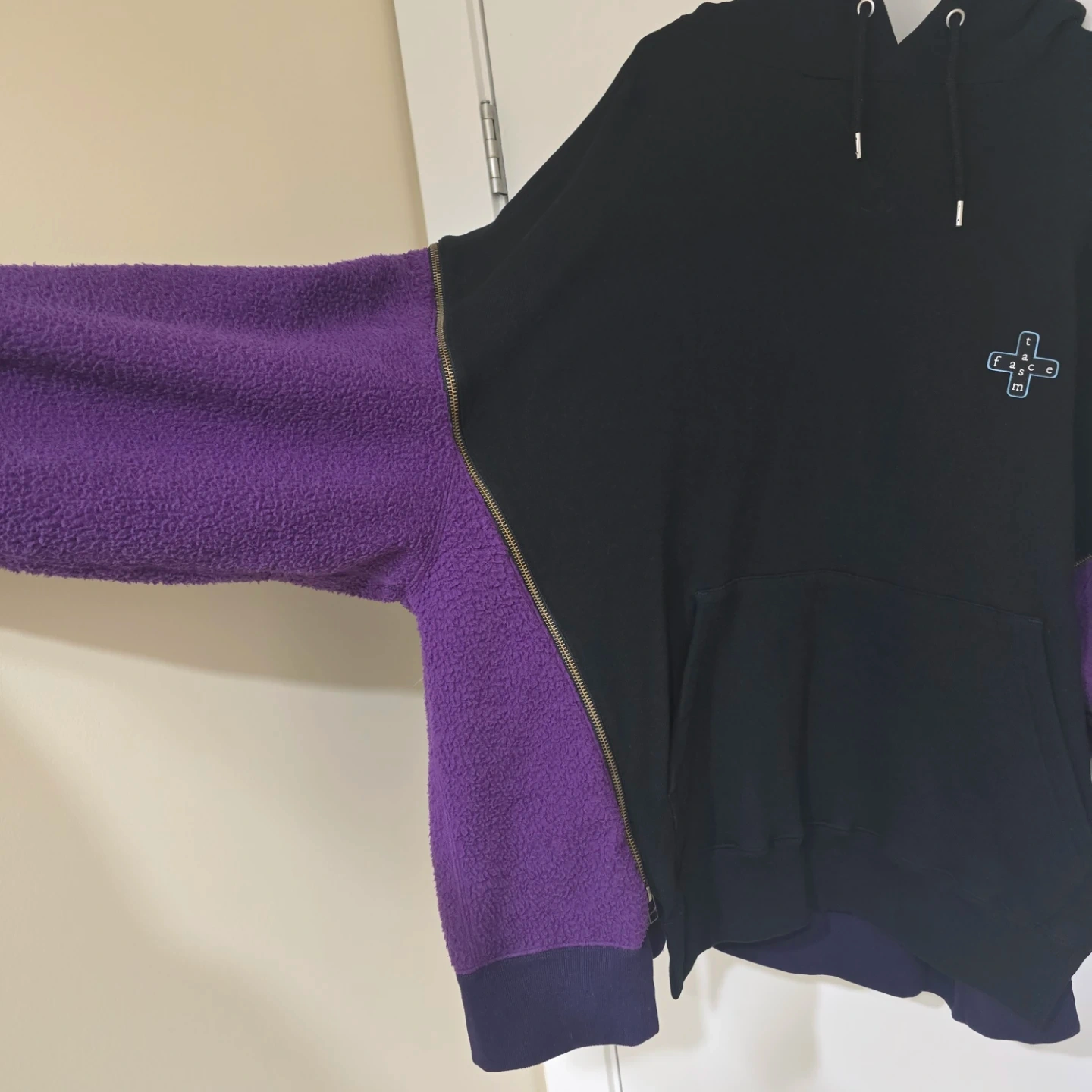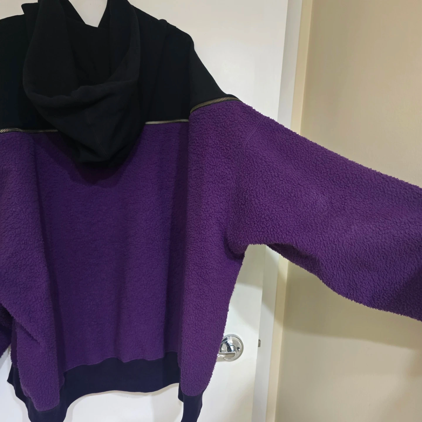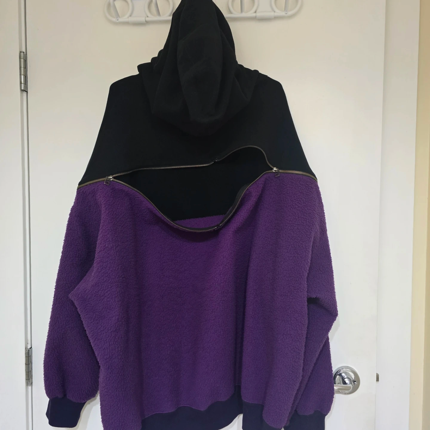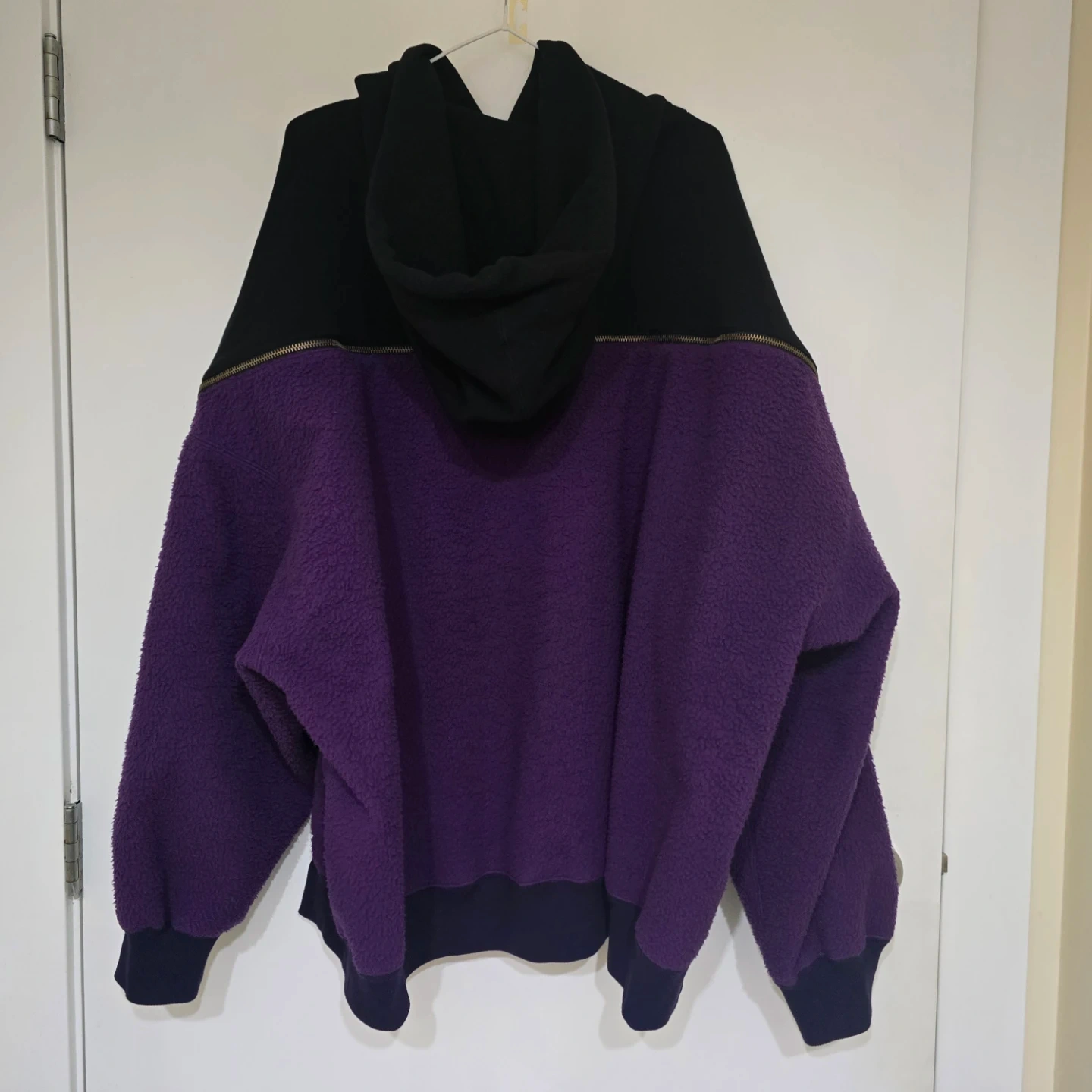 This is a black and purple fleece hoodie from Fasfce Canada. It features a zip-off fleece lower section and a contrasting black hood and upper body. The material is soft fleece. It ts free size over fit (around 3xl)