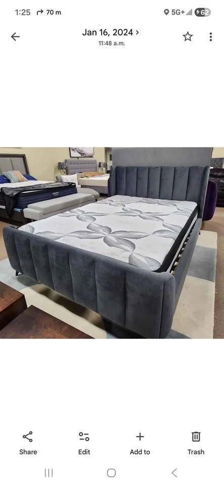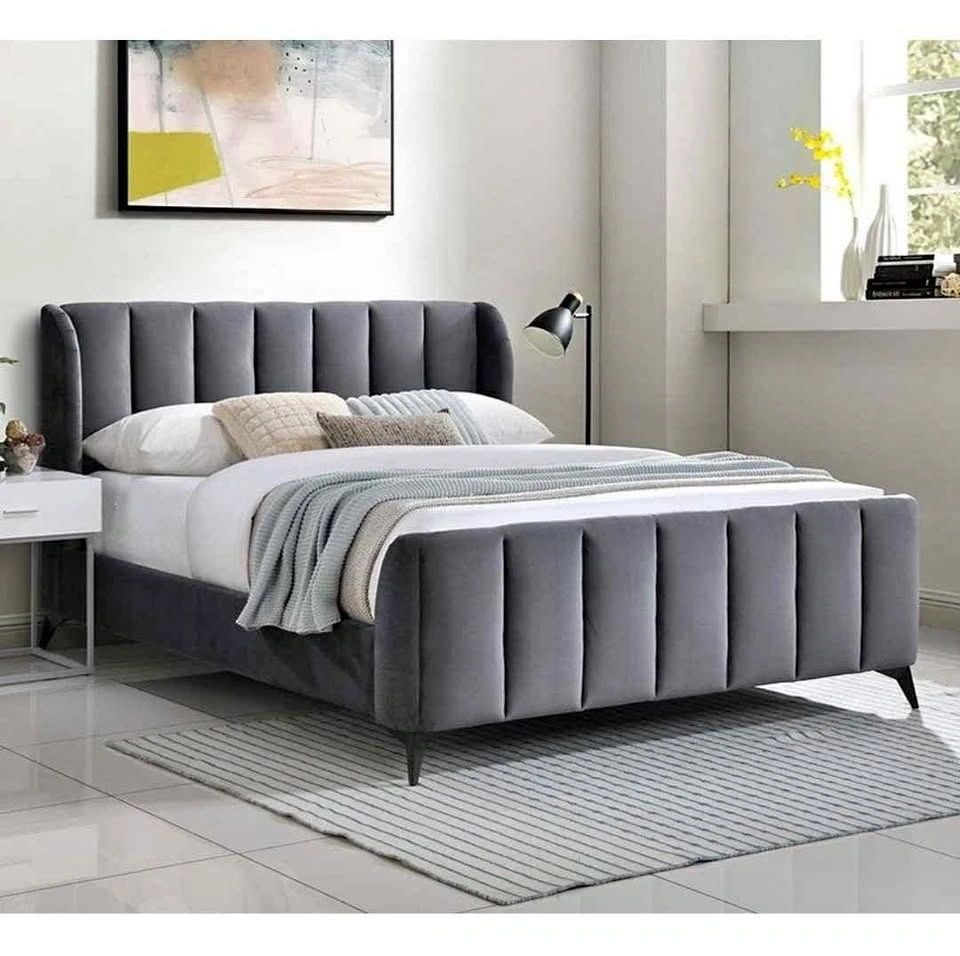 Wing headboard, black metal legs, grey velvet. Available with or without a memory foam mattress. Mattress adds $150 to the price.