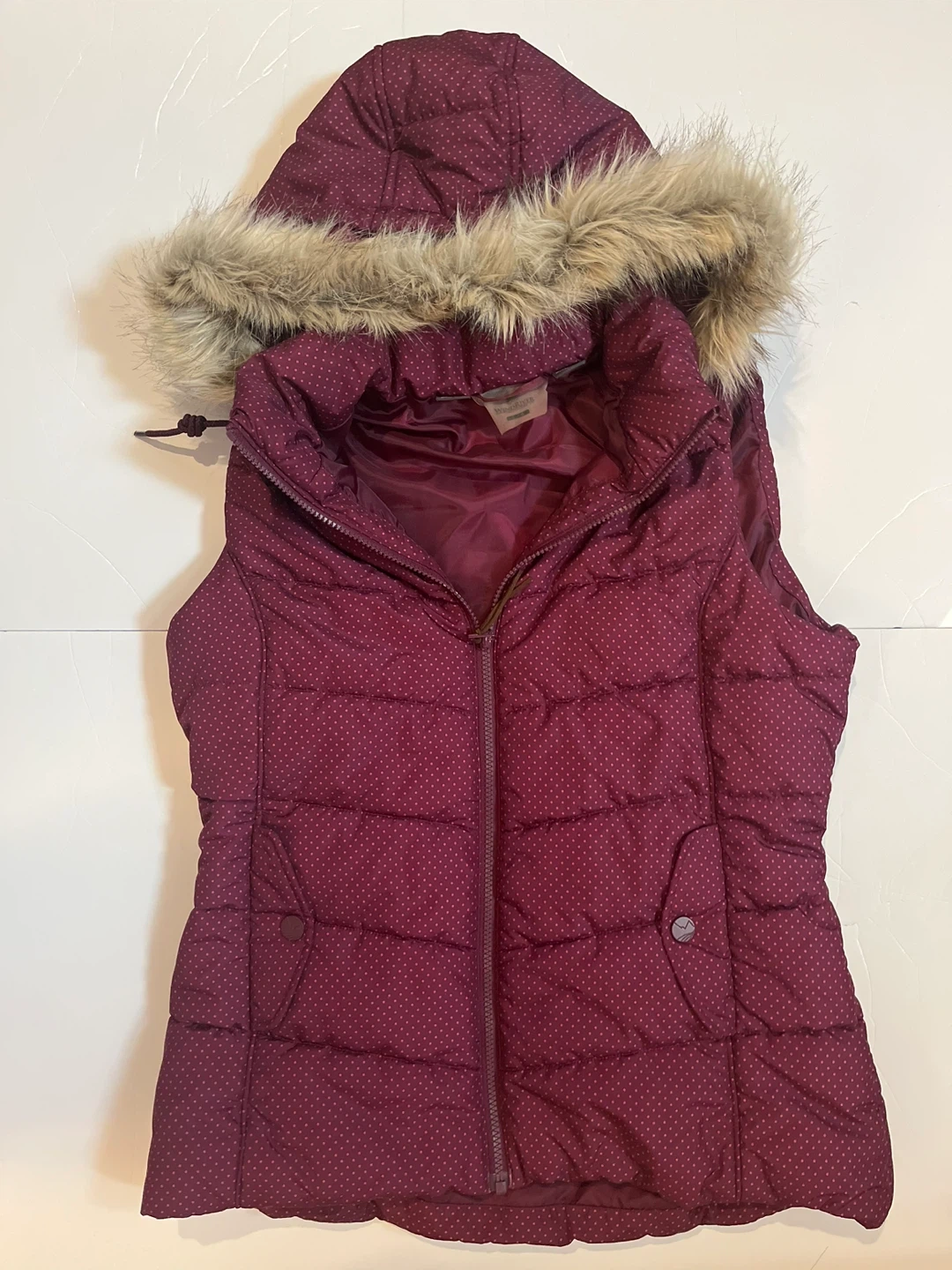 This women’s puffer vest is a rich plum colour with a white polka dot pattern. It features a detachable faux-fur trimmed hood and two front pockets with button closures. It's a great layering piece for cooler weather! Wind River large size T-max & Hyper Dri.