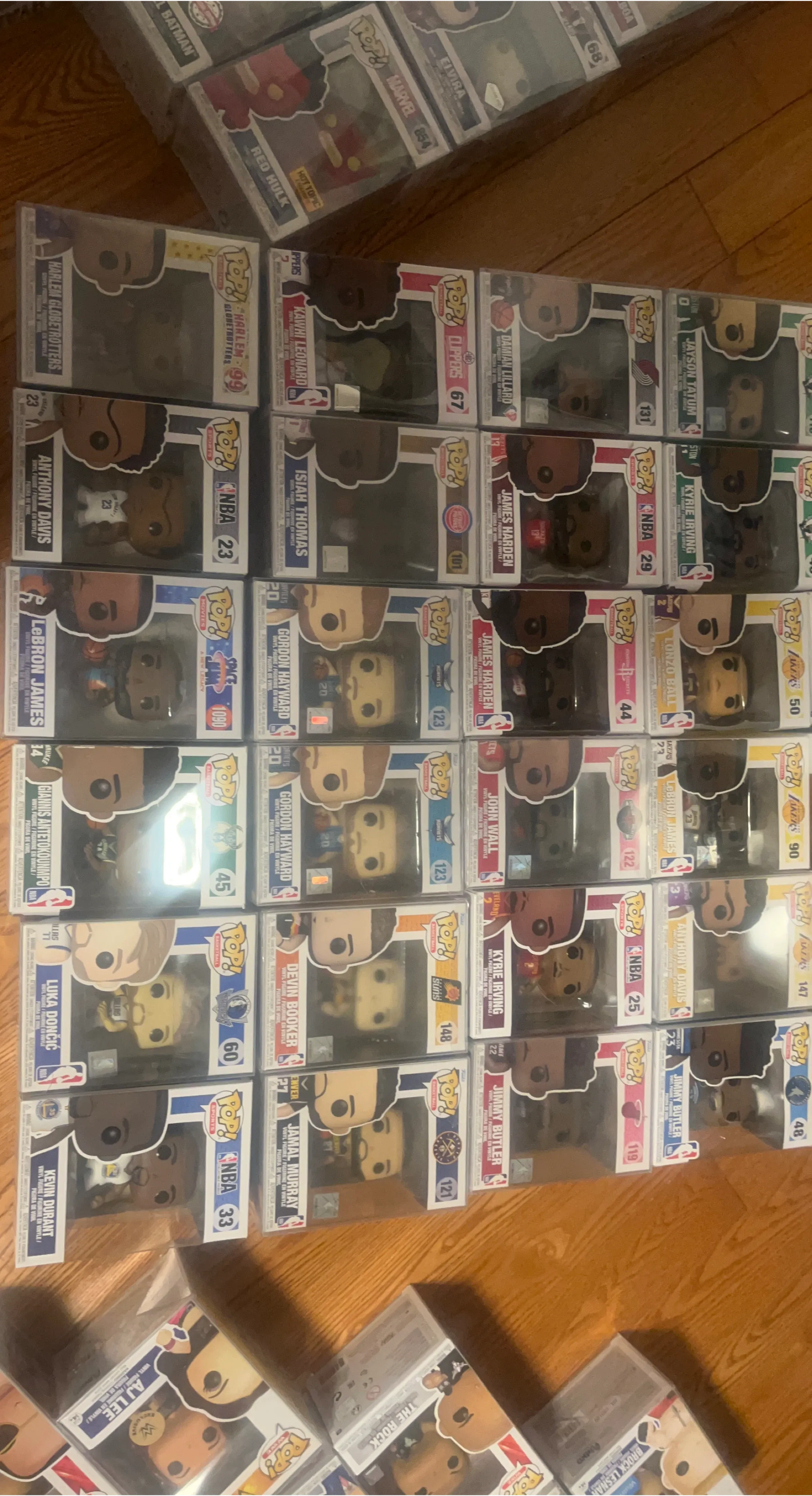 Collection of Funko Pop! vinyl figures featuring NBA stars like LeBron James, Anthony Davis, and Kyrie Irving, as well as characters like Elvira and Red Hulk. Figures include those from NBA, Marvel, and Space Jam collections. Mint condition in boxes.
