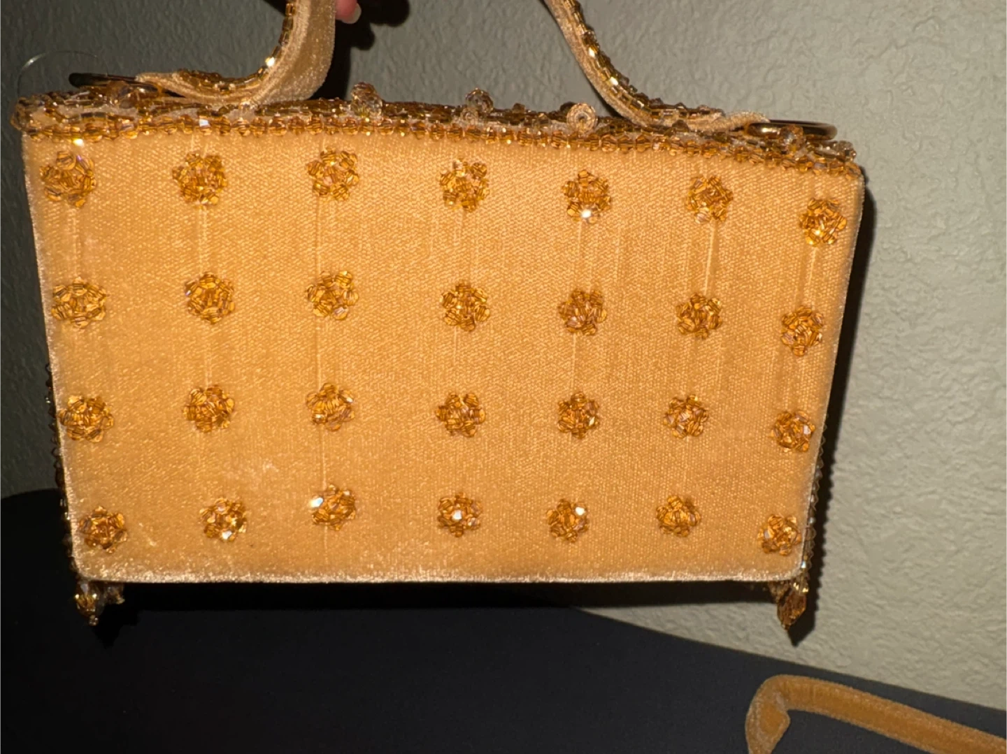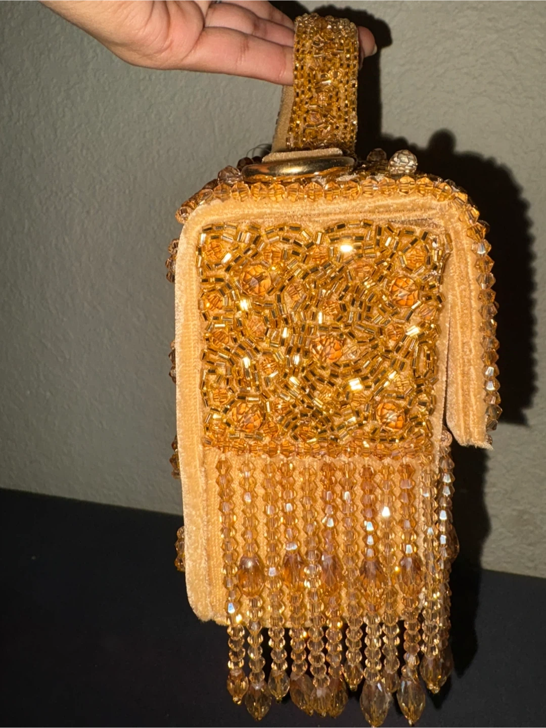 This is a stunning beaded evening handbag. It's covered in intricate beadwork and features a fringe of sparkling crystals. Comes with a removable gold chain strap.