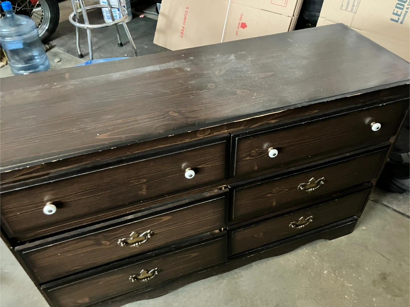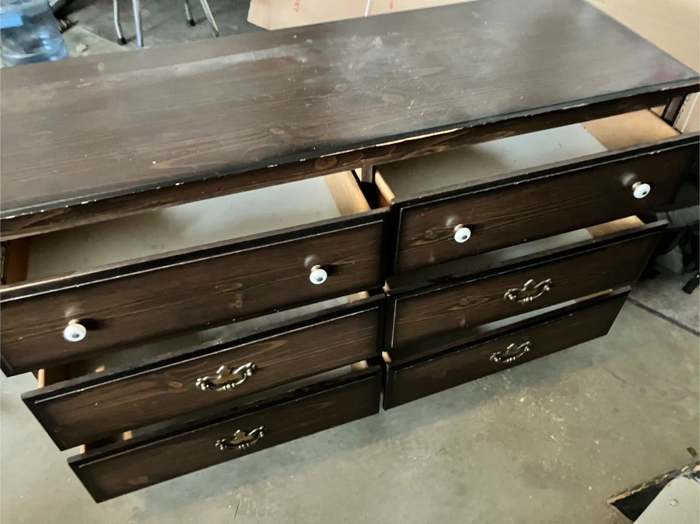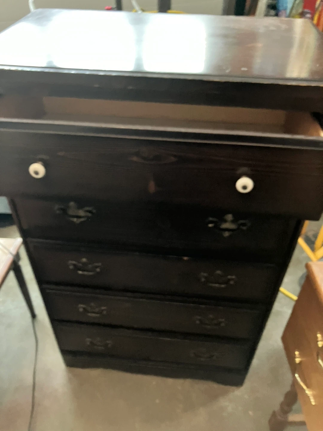 This set includes a five-drawer dresser and a one-drawer nightstand. Both pieces are dark wood with decorative drawer pulls and white knobs. They're great for bedroom storage! (3 in 1)